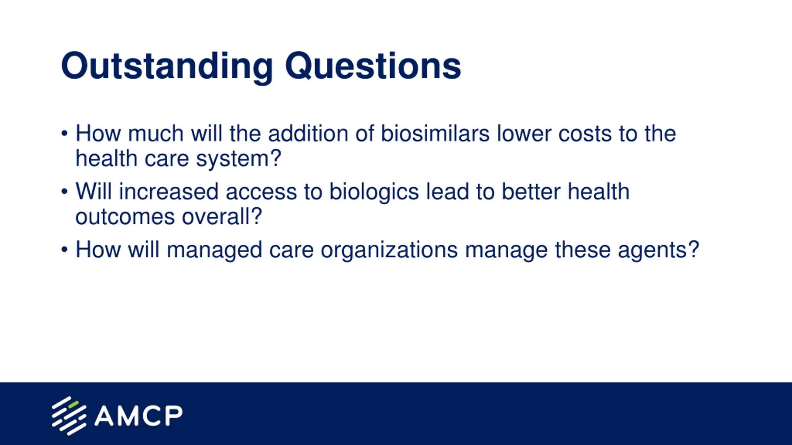 Outstanding Questions How much will the addition of biosimilars lower costs to the health care system? Will increased access to biologics lead to better health outcomes overall? How will managed care organizations manage these agents?
