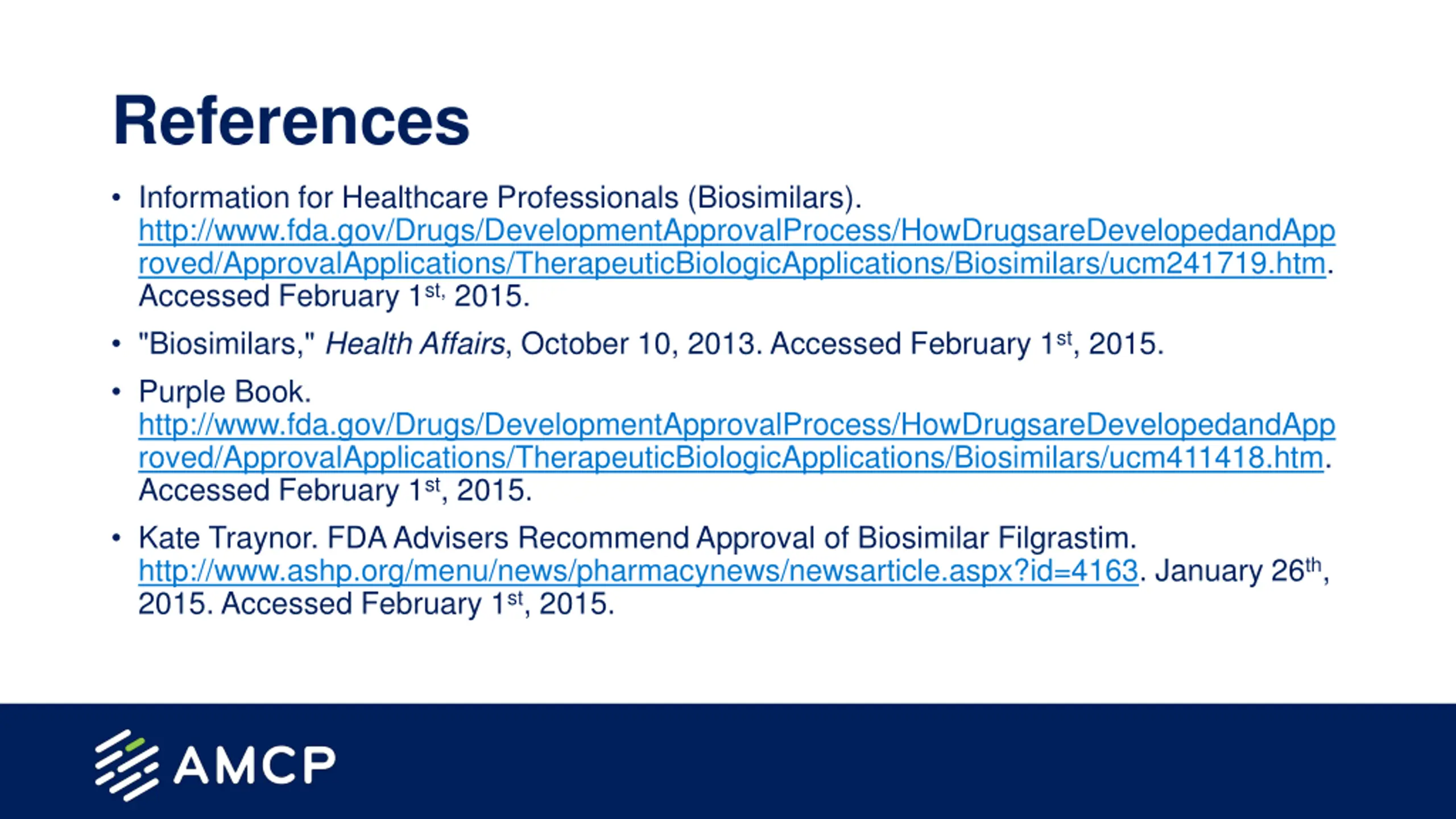 References Information for Healthcare Professionals (Biosimilars). http://www.fda.gov/Drugs/DevelopmentApprovalProcess/HowDrugsareDevelopedandApp roved/ApprovalApplications/TherapeuticBiologicApplications/Biosimilars/ucm241719.htm. Accessed February 1st, 2015. "Biosimilars," Health Affairs, October 10, 2013. Accessed February 1st, 2015. Purple Book. http://www.fda.gov/Drugs/DevelopmentApprovalProcess/HowDrugsareDevelopedandApp roved/ApprovalApplications/TherapeuticBiologicApplications/Biosimilars/ucm411418.htm. Accessed February 1st, 2015. Kate Traynor. FDA Advisers Recommend Approval of Biosimilar Filgrastim. http://www.ashp.org/menu/news/pharmacynews/newsarticle.aspx?id=4163. January 26th, 2015. Accessed February 1st, 2015.