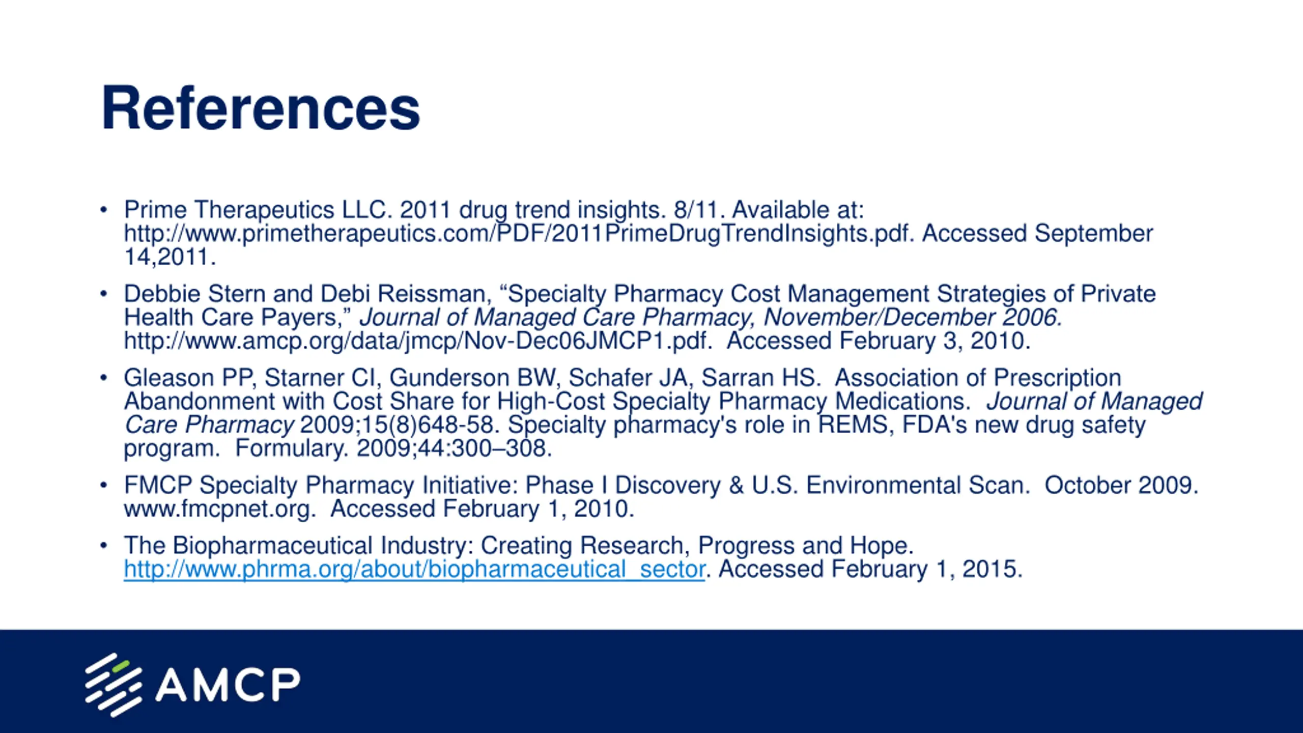 References Prime Therapeutics LLC. 2011 drug trend insights. 8/11. Available at: http://www.primetherapeutics.com/PDF/2011PrimeDrugTrendInsights.pdf. Accessed September 14,2011. Debbie Stern and Debi Reissman, Specialty Pharmacy Cost Management Strategies of Private Health Care Payers, Journal of Managed Care Pharmacy, November/December 2006. http://www.amcp.org/data/jmcp/Nov-Dec06JMCP1.pdf. Accessed February 3, 2010. Gleason PP, Starner CI, Gunderson BW, Schafer JA, Sarran HS. Association of Prescription Abandonment with Cost Share for High-Cost Specialty Pharmacy Medications. Journal of Managed Care Pharmacy 2009;15(8)648-58. Specialty pharmacy's role in REMS, FDA's new drug safety program. Formulary. 2009;44:300 308. FMCP Specialty Pharmacy Initiative: Phase I Discovery & U.S. Environmental Scan. October 2009. www.fmcpnet.org. Accessed February 1, 2010. The Biopharmaceutical Industry: Creating Research, Progress and Hope. http://www.phrma.org/about/biopharmaceutical_sector. Accessed February 1, 2015.