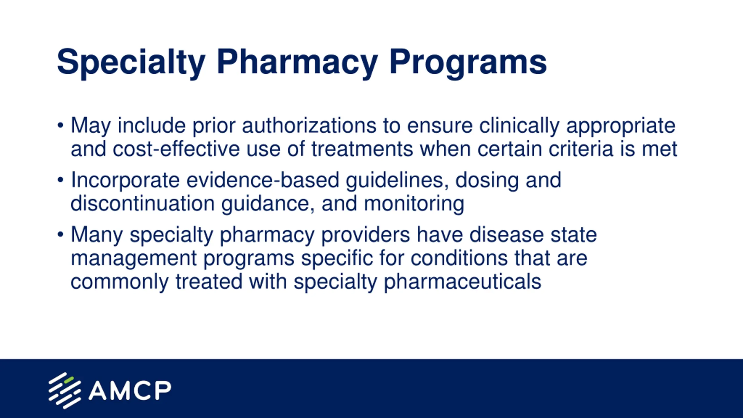 Specialty Pharmacy Programs May include prior authorizations to ensure clinically appropriate and cost-effective use of treatments when certain criteria is met Incorporate evidence-based guidelines, dosing and discontinuation guidance, and monitoring Many specialty pharmacy providers have disease state management programs specific for conditions that are commonly treated with specialty pharmaceuticals