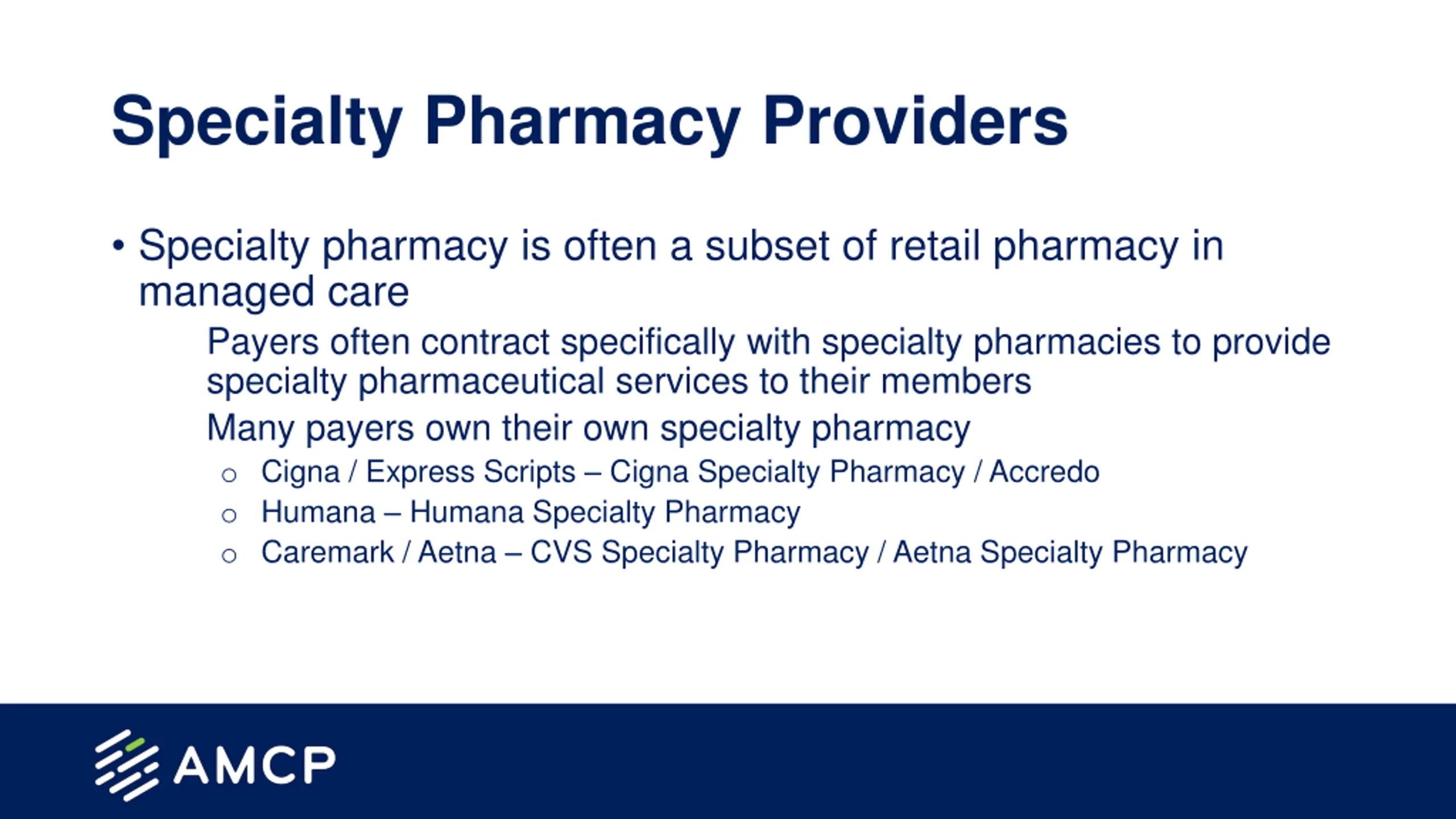 Specialty Pharmacy Providers Specialty pharmacy is often a subset of retail pharmacy in managed care Payers often contract specifically with specialty pharmacies to provide specialty pharmaceutical services to their members Many payers own their own specialty pharmacy o Cigna / Express Scripts Cigna Specialty Pharmacy / Accredo o Humana Humana Specialty Pharmacy o Caremark / Aetna CVS Specialty Pharmacy / Aetna Specialty Pharmacy
