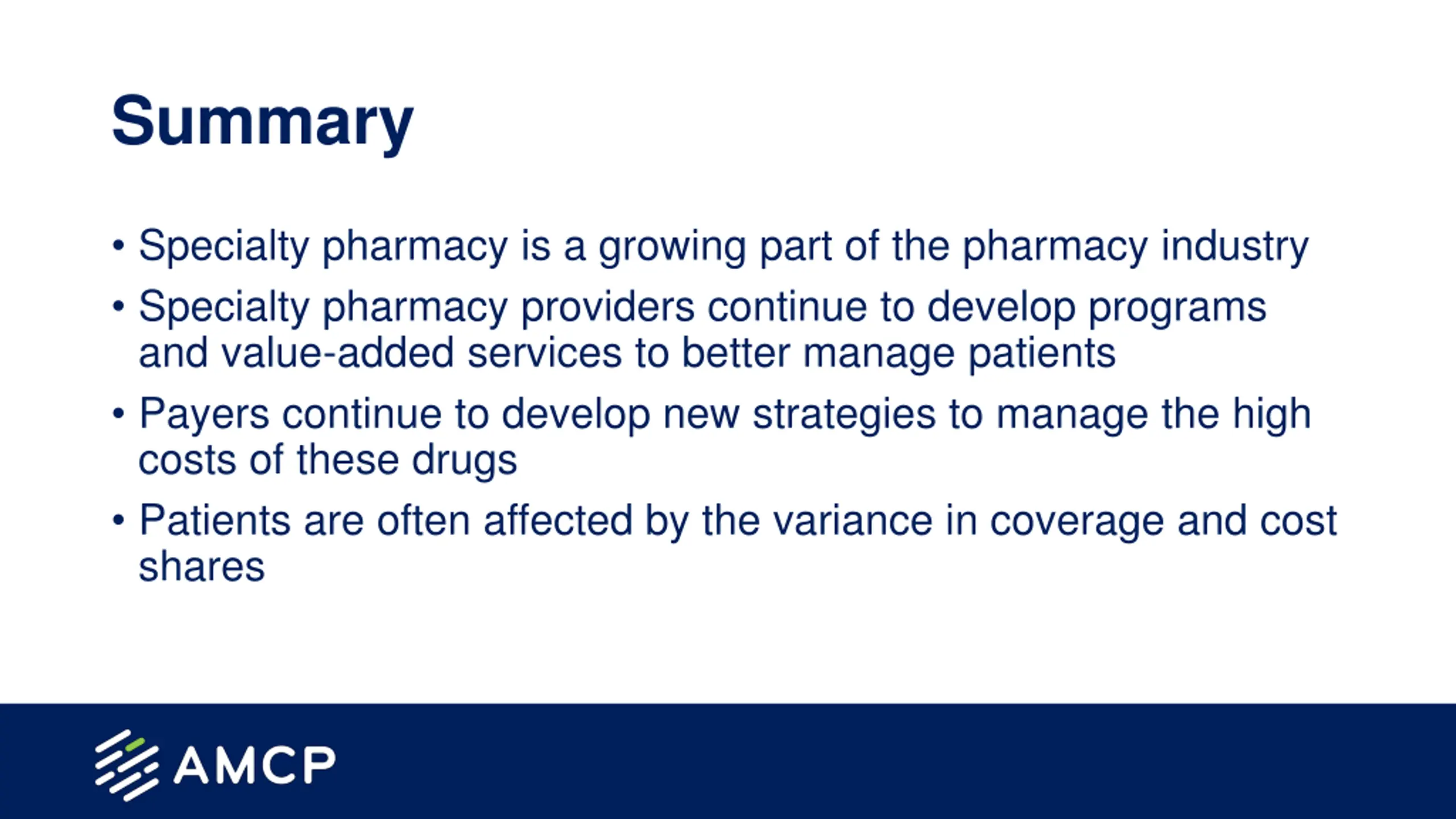 Summary Specialty pharmacy is a growing part of the pharmacy industry Specialty pharmacy providers continue to develop programs and value-added services to better manage patients Payers continue to develop new strategies to manage the high costs of these drugs Patients are often affected by the variance in coverage and cost shares