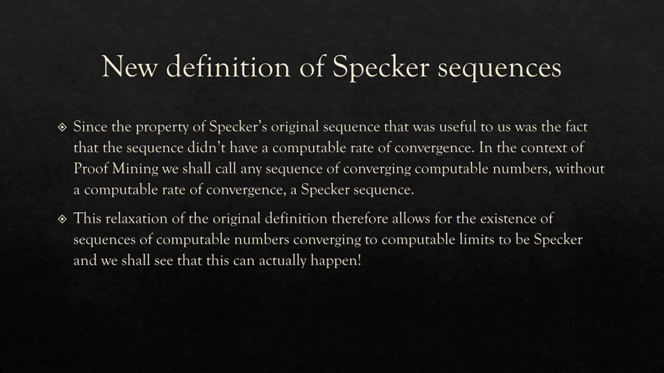New definition of Specker sequences Since the property of Specker s original sequence that was useful to us was the fact that the sequence didn t have a computable rate of convergence. In the context of Proof Mining we shall call any sequence of converging computable numbers, without a computable rate of convergence, a Specker sequence. This relaxation of the original definition therefore allows for the existence of sequences of computable numbers converging to computable limits to be Specker and we shall see that this can actually happen!