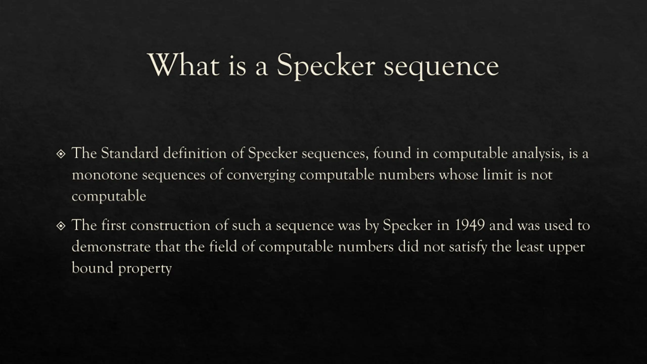 What is a Specker sequence The Standard definition of Specker sequences, found in computable analysis, is a monotone sequences of converging computable numbers whose limit is not computable The first construction of such a sequence was by Specker in 1949 and was used to demonstrate that the field of computable numbers did not satisfy the least upper bound property