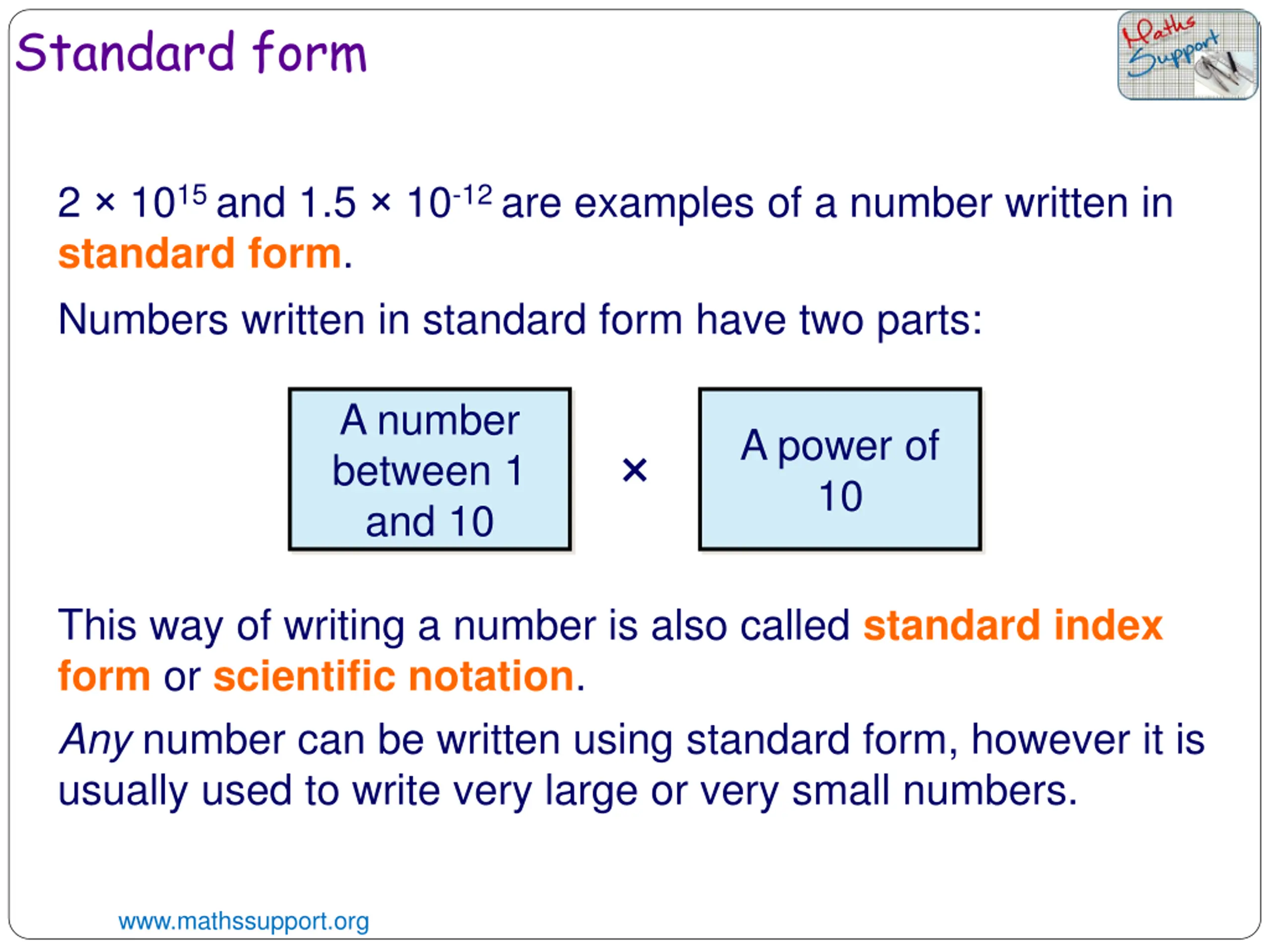 Standard form 2 1015 and 1.5 10-12 are examples of a number written in standard form. Numbers written in standard form have two parts: A number between 1 and 10 A power of 10 This way of writing a number is also called standard index form or scientific notation. Any number can be written using standard form, however it is usually used to write very large or very small numbers. www.mathssupport.org