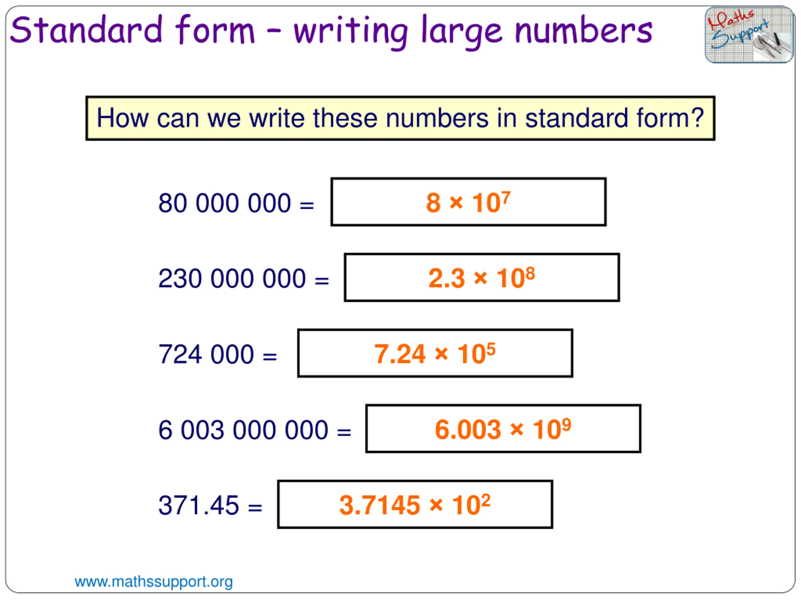 Standard form writing large numbers How can we write these numbers in standard form? 80 000 000 = 8 107 230 000 000 = 2.3 108 7.24 105 724 000 = 6.003 109 6 003 000 000 = 371.45 = 3.7145 102 www.mathssupport.org