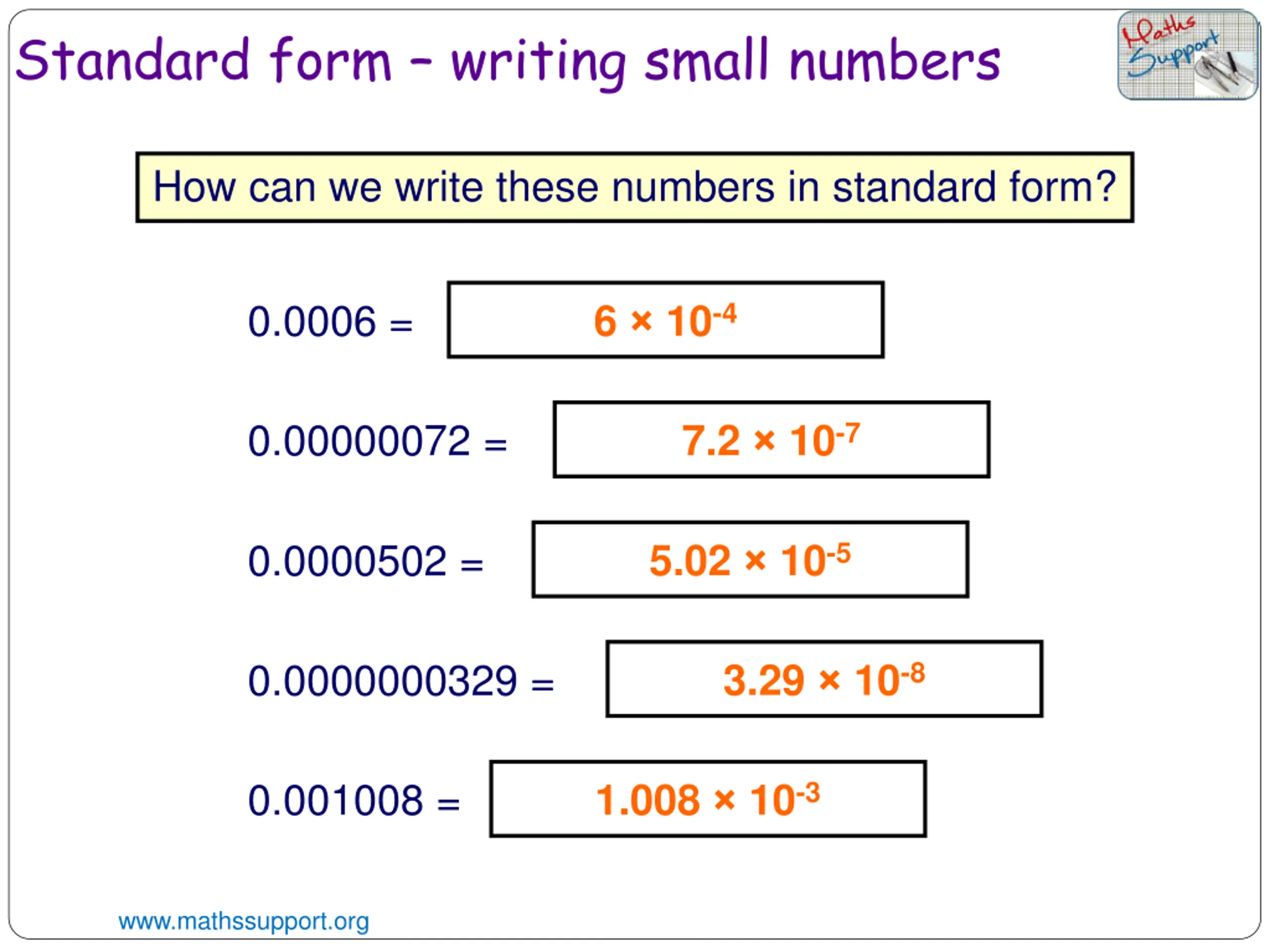 Standard form writing small numbers These numbers are written in standard form. How can they be written as ordinary numbers? 8 10-4 = 0.0008 2.6 10-6 = 0.0000026 0.00000009108 9.108 10-8 = 0.00007329 7.329 10-5 = 8.4542 10-2 = 0.084542 www.mathssupport.org