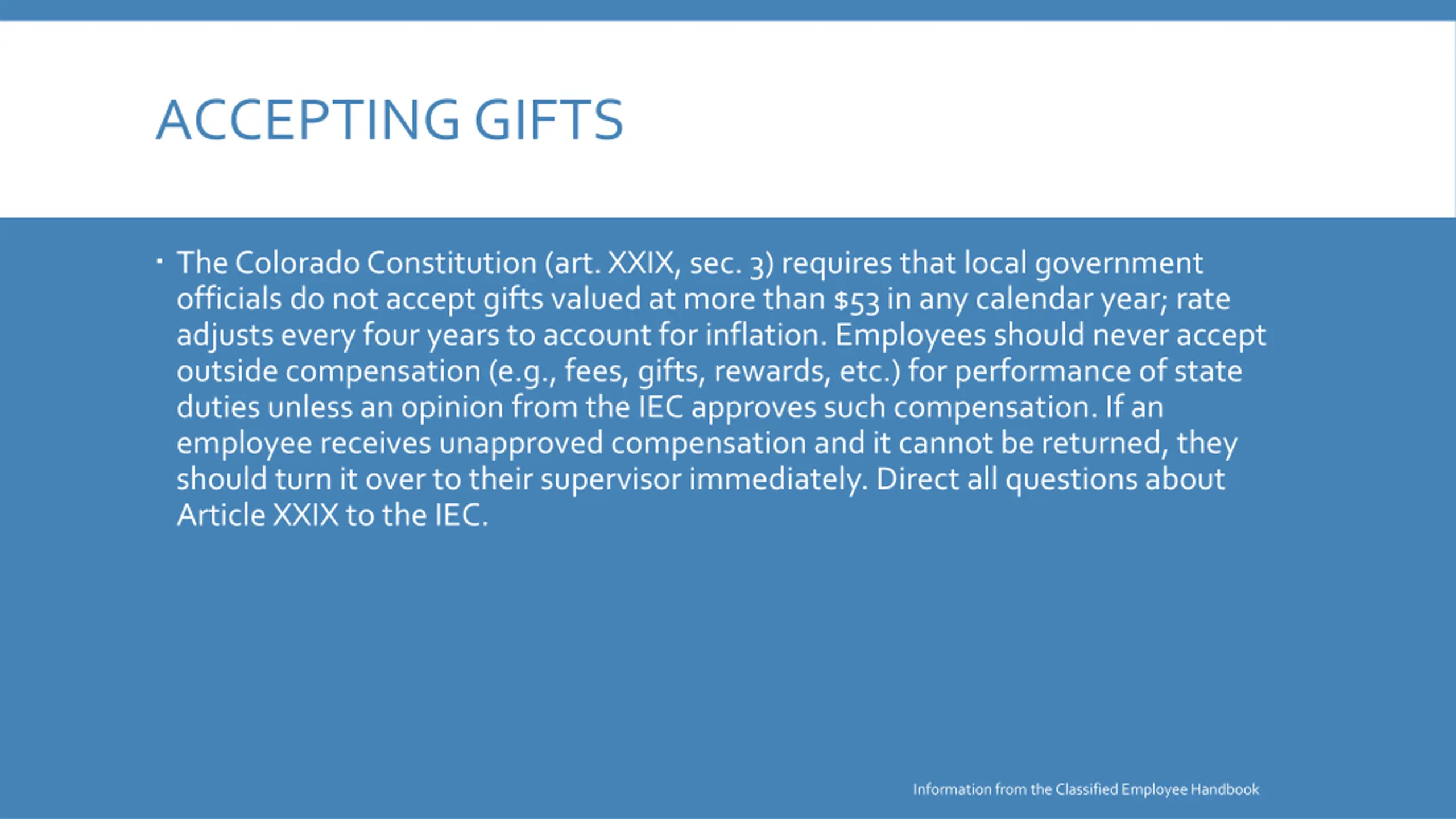 ACCEPTING GIFTS The Colorado Constitution (art. XXIX, sec. 3) requires that local government officials do not accept gifts valued at more than $53 in any calendar year; rate adjusts every four years to account for inflation. Employees should never accept outside compensation (e.g., fees, gifts, rewards, etc.) for performance of state duties unless an opinion from the IEC approves such compensation. If an employee receives unapproved compensation and it cannot be returned, they should turn it over to their supervisor immediately. Direct all questions about Article XXIX to the IEC. Information from the Classified Employee Handbook