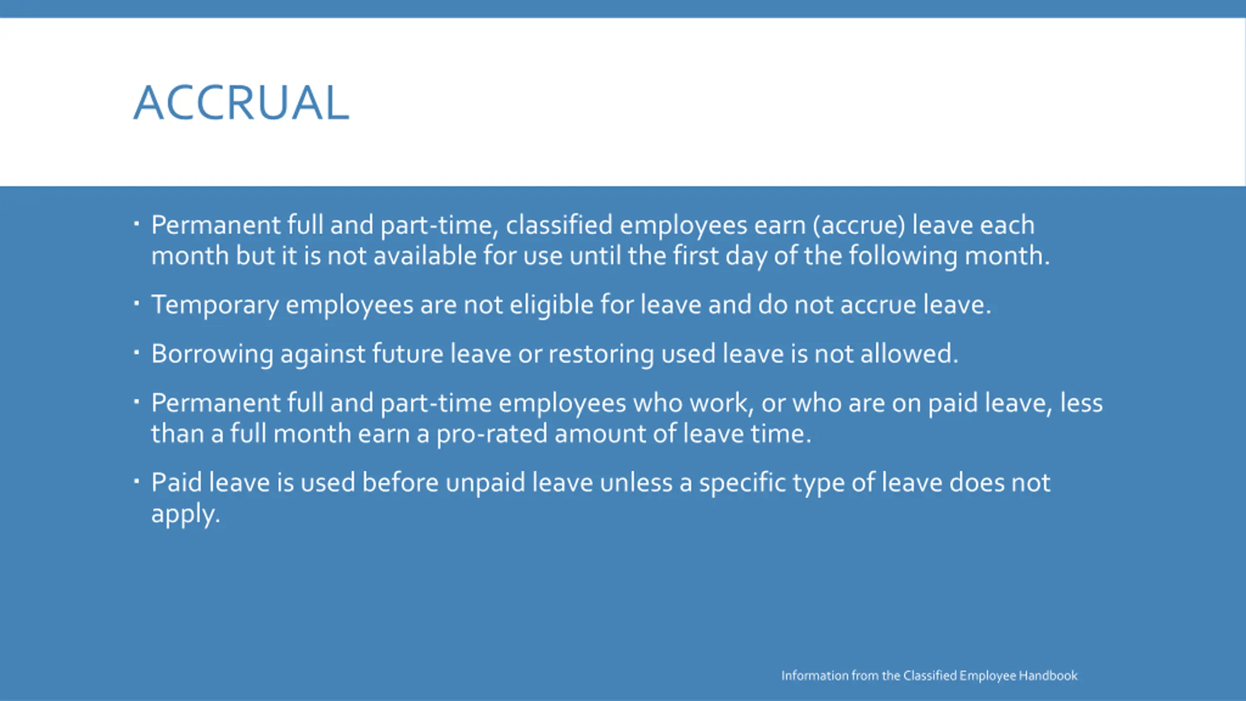 ACCRUAL Permanent full and part-time, classified employees earn (accrue) leave each month but it is not available for use until the first day of the following month. Temporary employees are not eligible for leave and do not accrue leave. Borrowing against future leave or restoring used leave is not allowed. Permanent full and part-time employees who work, or who are on paid leave, less than a full month earn a pro-rated amount of leave time. Paid leave is used before unpaid leave unless a specific type of leave does not apply. Information from the Classified Employee Handbook