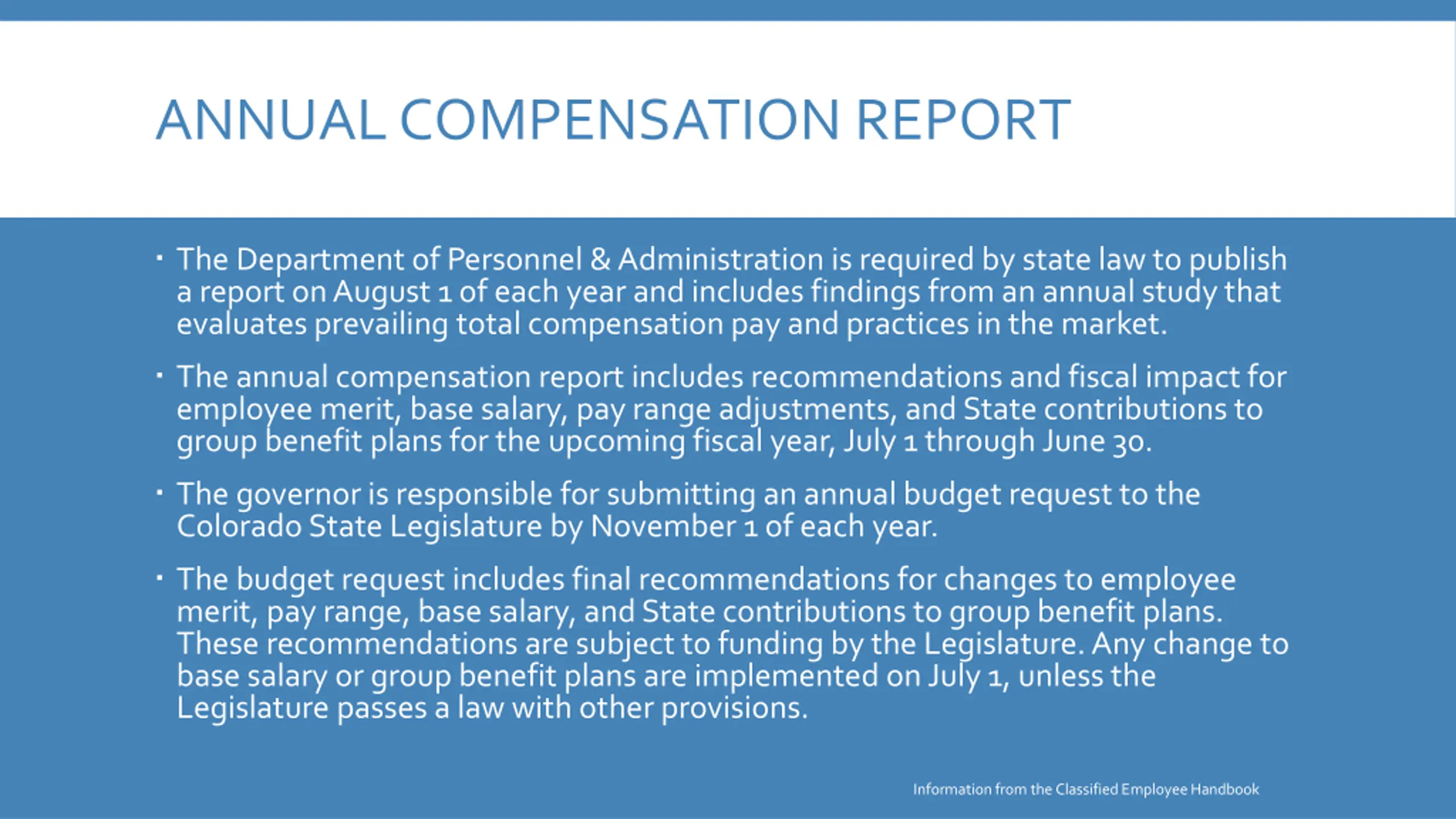 ANNUAL COMPENSATION REPORT The Department of Personnel & Administration is required by state law to publish a report on August 1 of each year and includes findings from an annual study that evaluates prevailing total compensation pay and practices in the market. The annual compensation report includes recommendations and fiscal impact for employee merit, base salary, pay range adjustments, and State contributions to group benefit plans for the upcoming fiscal year, July 1 through June 30. The governor is responsible for submitting an annual budget request to the Colorado State Legislature by November 1 of each year. The budget request includes final recommendations for changes to employee merit, pay range, base salary, and State contributions to group benefit plans. These recommendations are subject to funding by the Legislature. Any change to base salary or group benefit plans are implemented on July 1, unless the Legislature passes a law with other provisions. Information from the Classified Employee Handbook