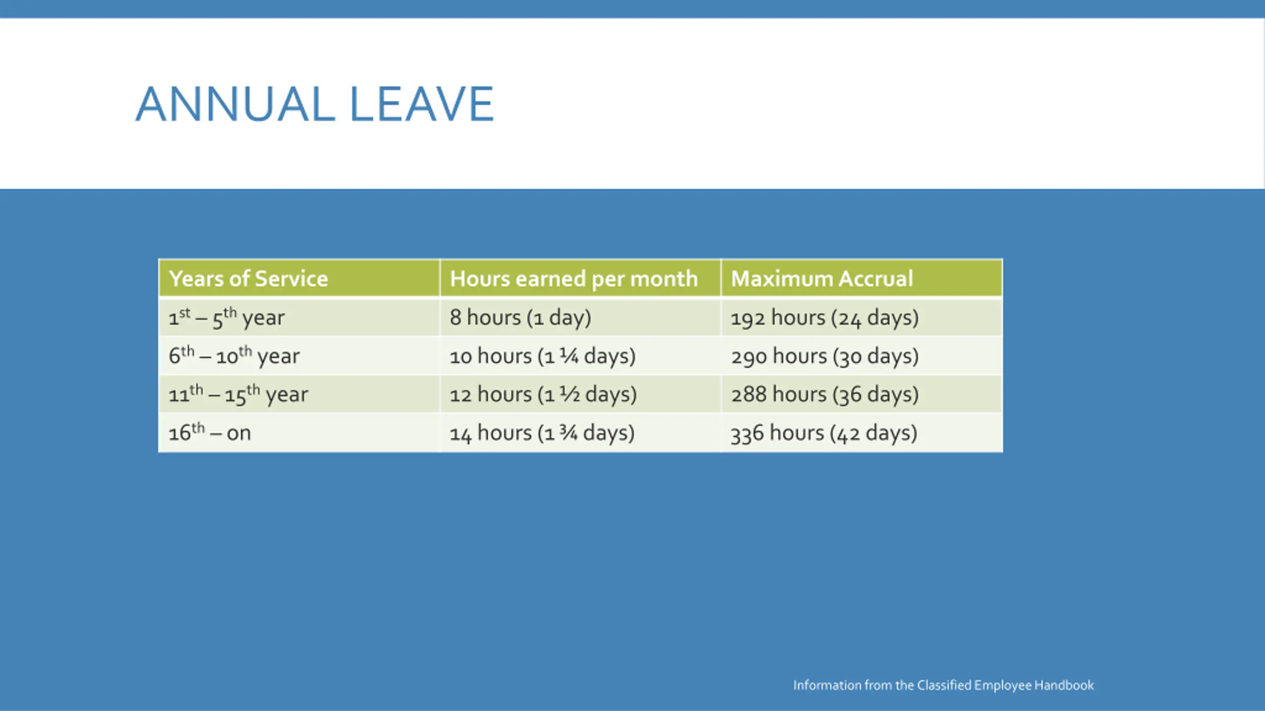 ANNUAL LEAVE Years of Service Hours earned per month Maximum Accrual 1st 5th year 8 hours (1 day) 192 hours (24 days) 6th 10th year 10 hours (1 days) 290 hours (30 days) 11th 15th year 12 hours (1 days) 288 hours (36 days) 16th on 14 hours (1 days) 336 hours (42 days) Information from the Classified Employee Handbook
