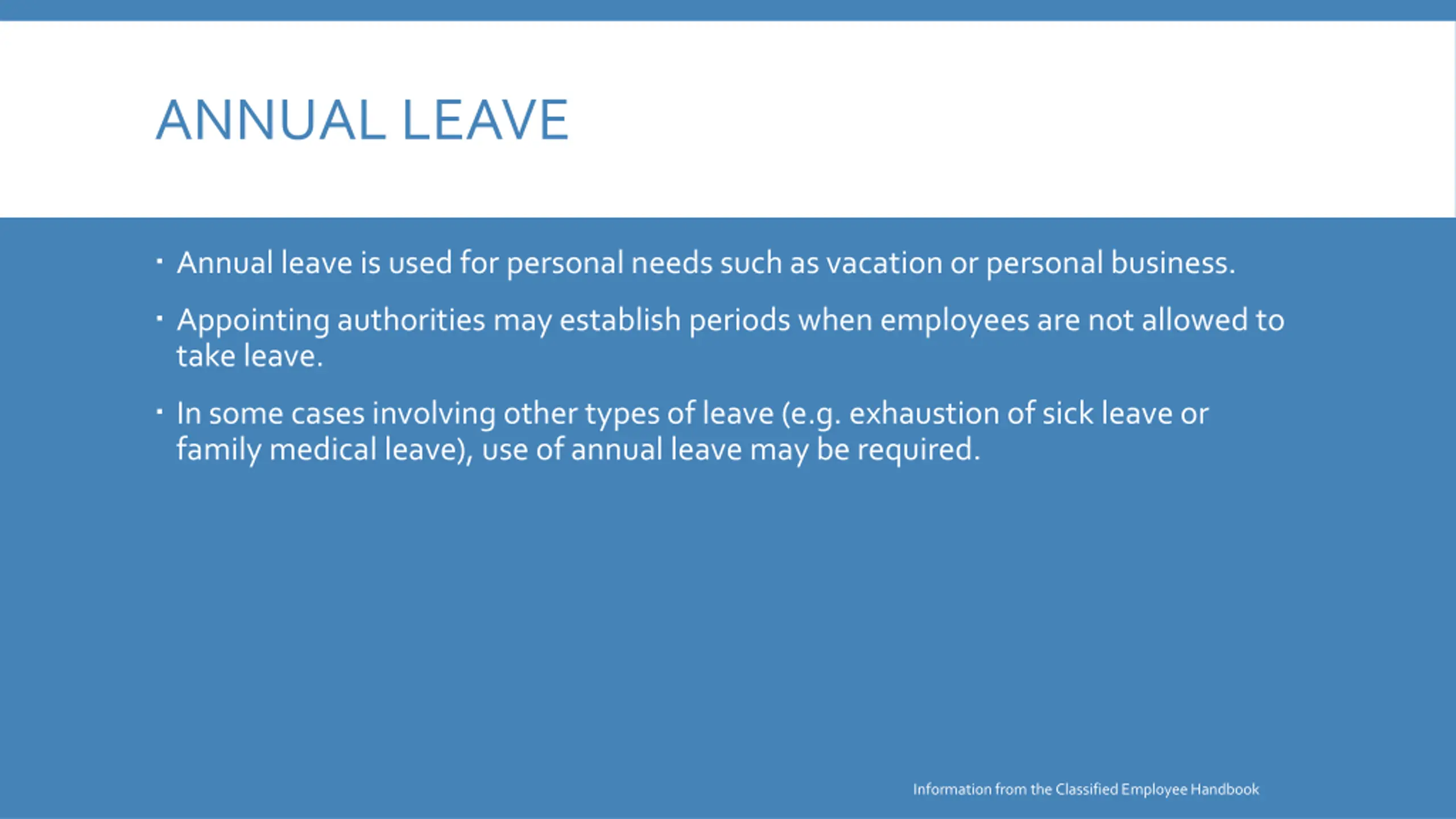 ANNUAL LEAVE Annual leave is used for personal needs such as vacation or personal business. Appointing authorities may establish periods when employees are not allowed to take leave. In some cases involving other types of leave (e.g. exhaustion of sick leave or family medical leave), use of annual leave may be required. Information from the Classified Employee Handbook