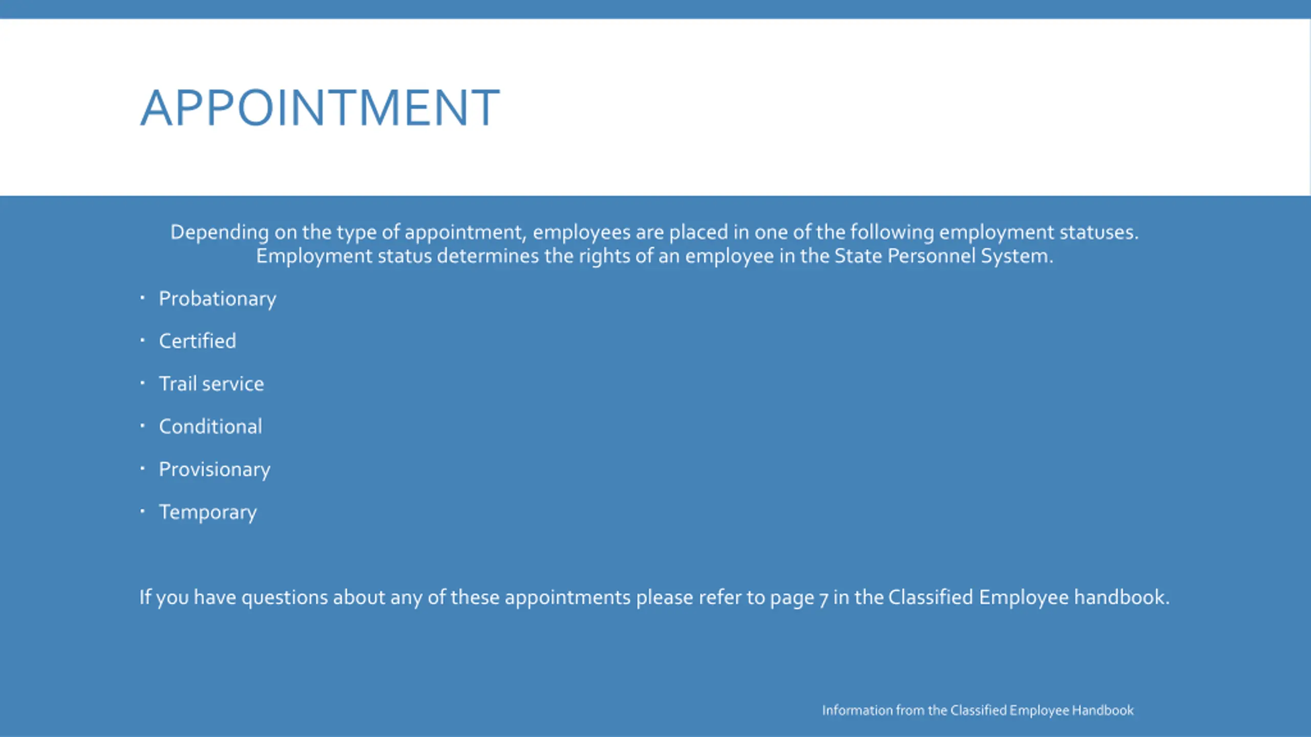 APPOINTMENT Depending on the type of appointment, employees are placed in one of the following employment statuses. Employment status determines the rights of an employee in the State Personnel System. Probationary Certified Trail service Conditional Provisionary Temporary If you have questions about any of these appointments please refer to page 7 in the Classified Employee handbook. Information from the Classified Employee Handbook