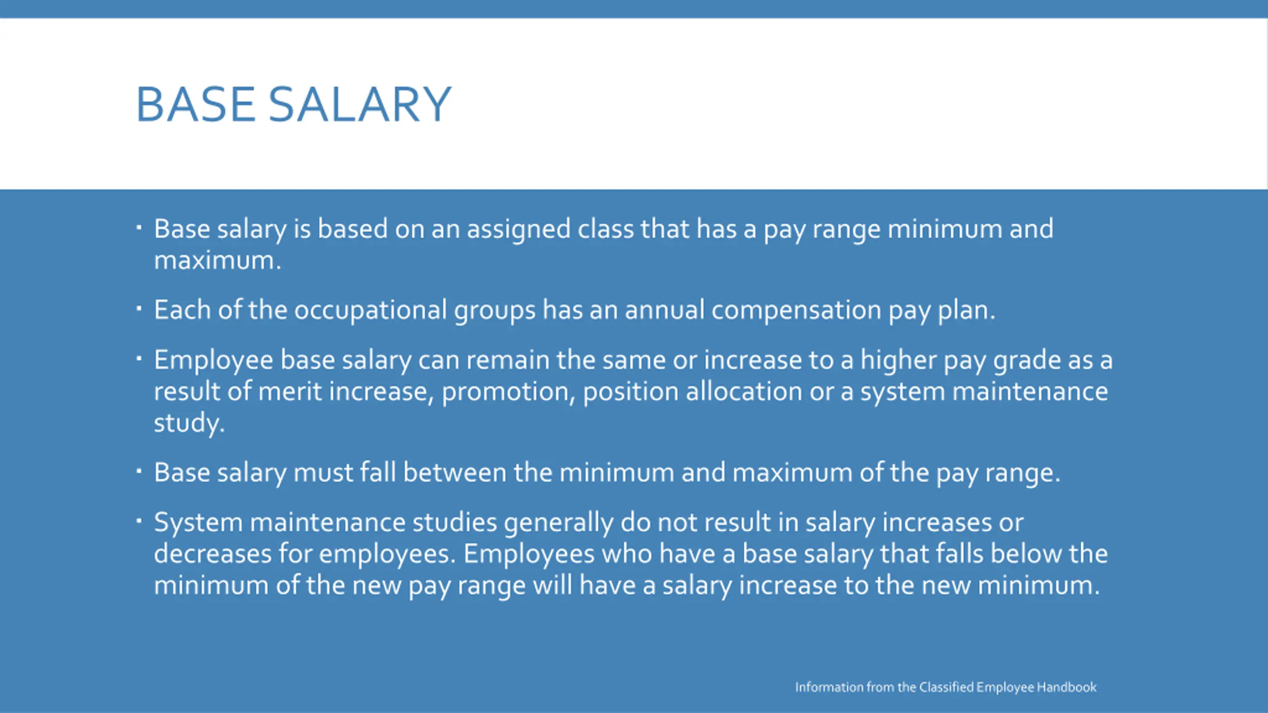 BASE SALARY Base salary is based on an assigned class that has a pay range minimum and maximum. Each of the occupational groups has an annual compensation pay plan. Employee base salary can remain the same or increase to a higher pay grade as a result of merit increase, promotion, position allocation or a system maintenance study. Base salary must fall between the minimum and maximum of the pay range. System maintenance studies generally do not result in salary increases or decreases for employees. Employees who have a base salary that falls below the minimum of the new pay range will have a salary increase to the new minimum. Information from the Classified Employee Handbook