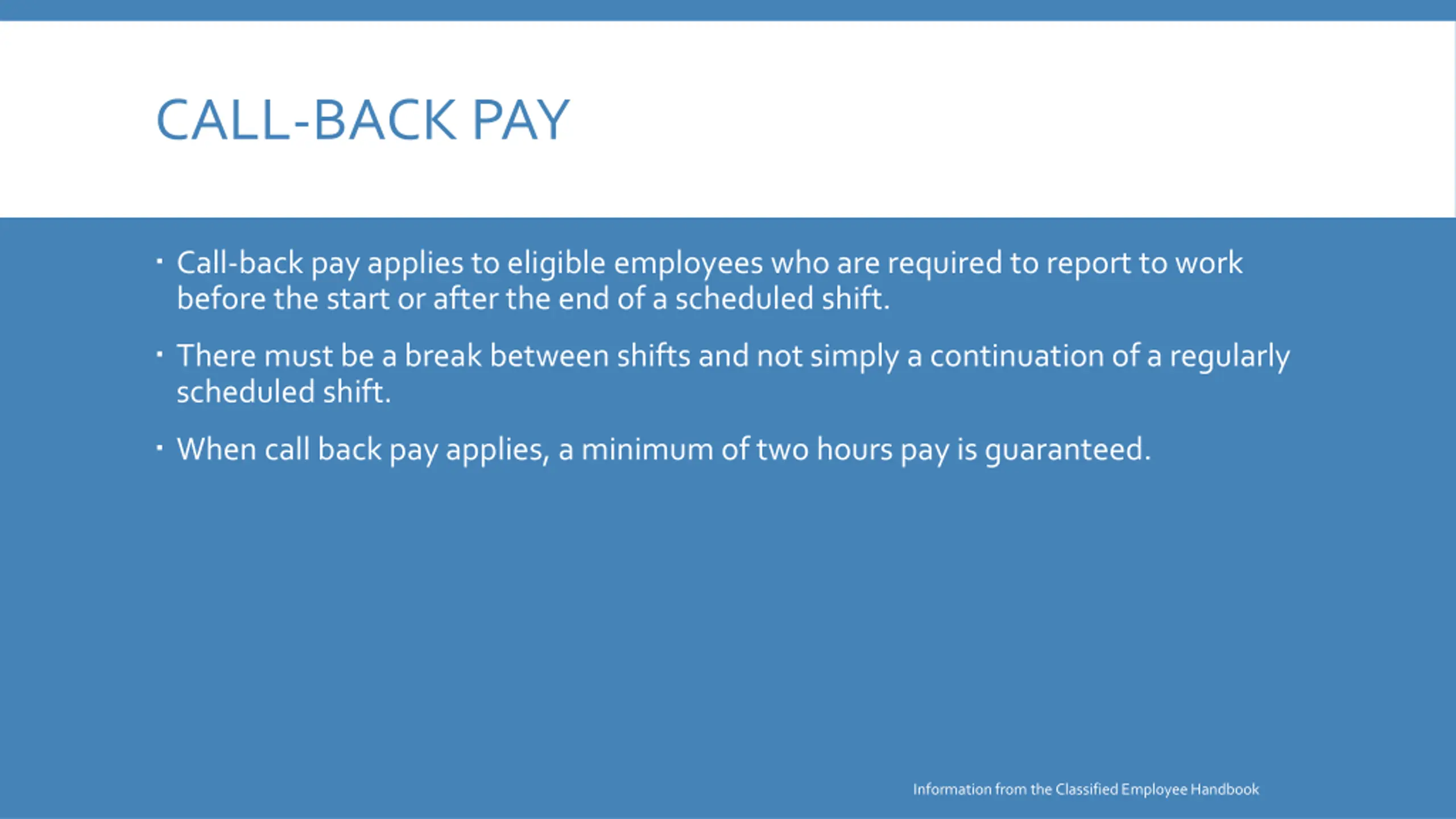 CALL-BACK PAY Call-back pay applies to eligible employees who are required to report to work before the start or after the end of a scheduled shift. There must be a break between shifts and not simply a continuation of a regularly scheduled shift. When call back pay applies, a minimum of two hours pay is guaranteed. Information from the Classified Employee Handbook