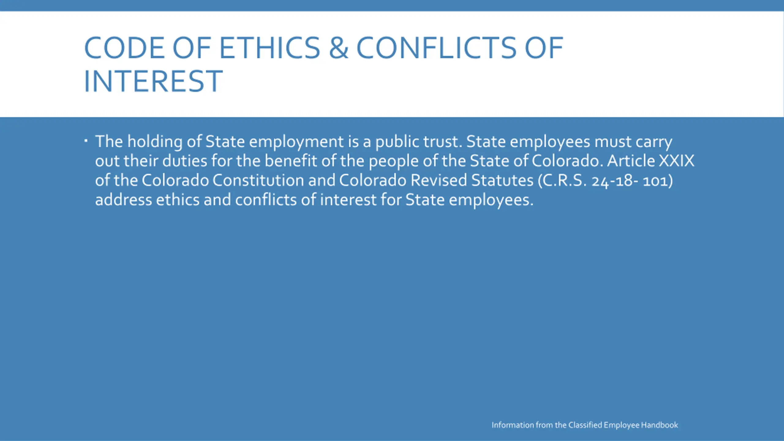 CODE OF ETHICS & CONFLICTS OF INTEREST The holding of State employment is a public trust. State employees must carry out their duties for the benefit of the people of the State of Colorado. Article XXIX of the Colorado Constitution and Colorado Revised Statutes (C.R.S. 24-18- 101) address ethics and conflicts of interest for State employees. Information from the Classified Employee Handbook