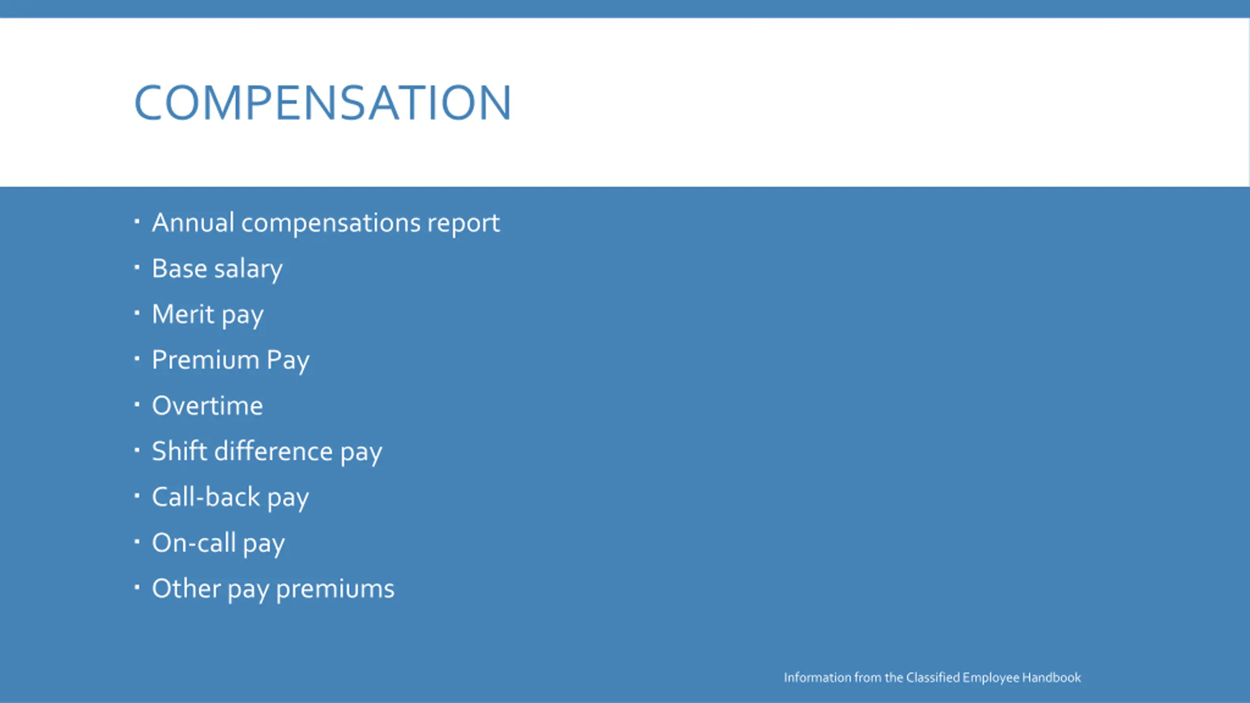 COMPENSATION Annual compensations report Base salary Merit pay Premium Pay Overtime Shift difference pay Call-back pay On-call pay Other pay premiums Information from the Classified Employee Handbook