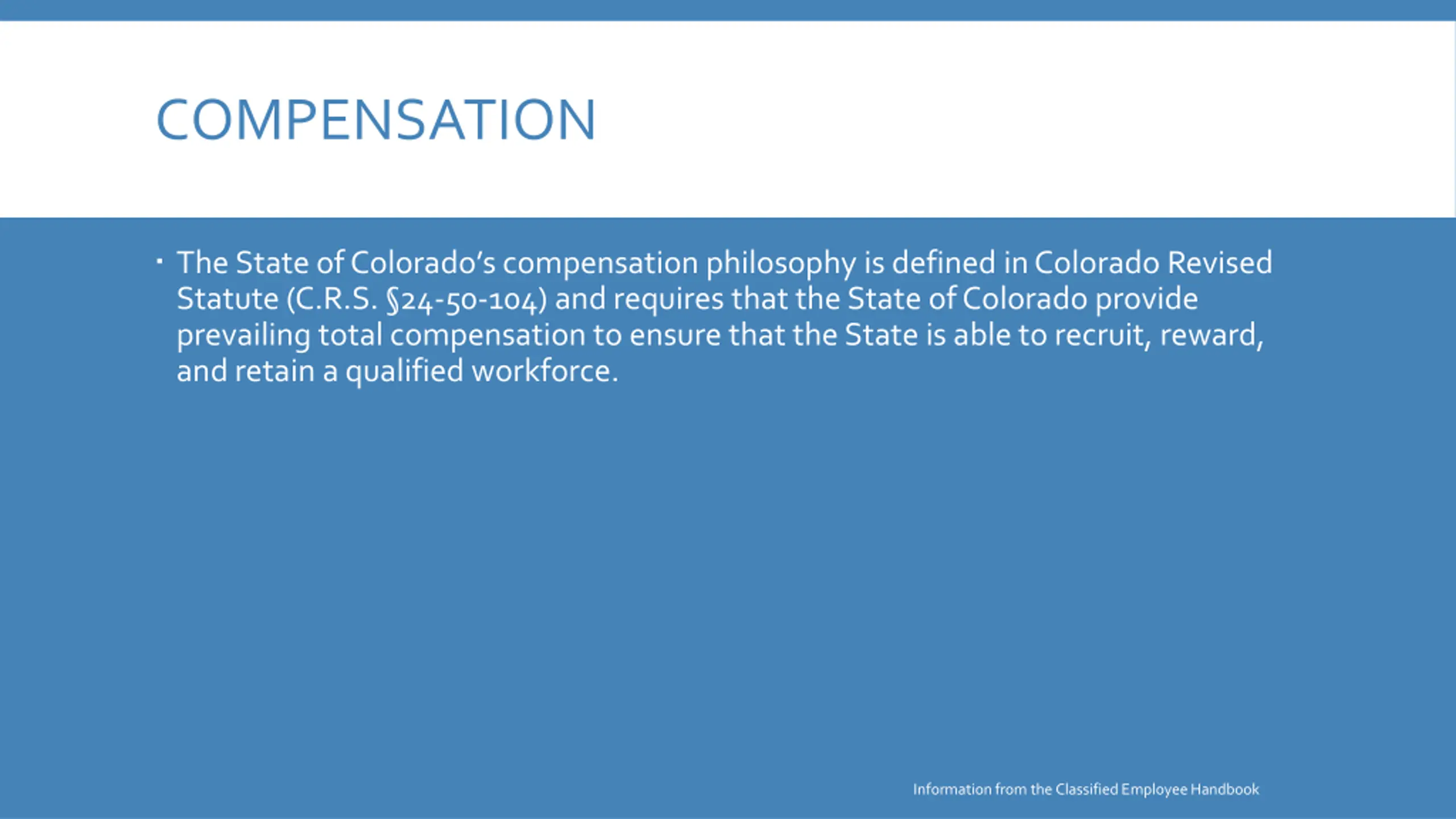 COMPENSATION The State of Colorado s compensation philosophy is defined in Colorado Revised Statute (C.R.S. 24-50-104) and requires that the State of Colorado provide prevailing total compensation to ensure that the State is able to recruit, reward, and retain a qualified workforce. Information from the Classified Employee Handbook