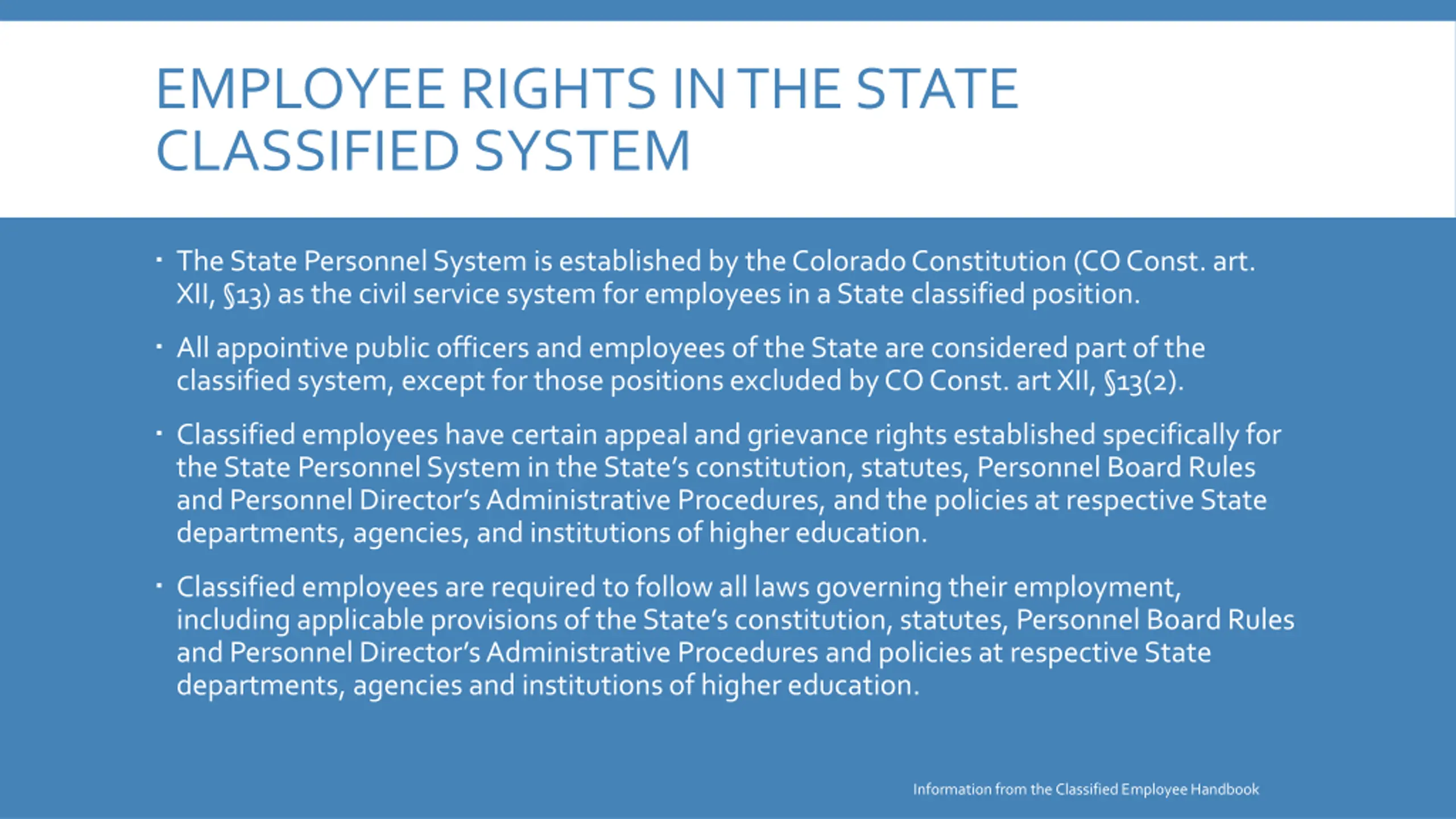 EMPLOYEE RIGHTS IN THE STATE CLASSIFIED SYSTEM The State Personnel System is established by the Colorado Constitution (CO Const. art. XII, 13) as the civil service system for employees in a State classified position. All appointive public officers and employees of the State are considered part of the classified system, except for those positions excluded by CO Const. art XII, 13(2). Classified employees have certain appeal and grievance rights established specifically for the State Personnel System in the State s constitution, statutes, Personnel Board Rules and Personnel Director s Administrative Procedures, and the policies at respective State departments, agencies, and institutions of higher education. Classified employees are required to follow all laws governing their employment, including applicable provisions of the State s constitution, statutes, Personnel Board Rules and Personnel Director s Administrative Procedures and policies at respective State departments, agencies and institutions of higher education. Information from the Classified Employee Handbook