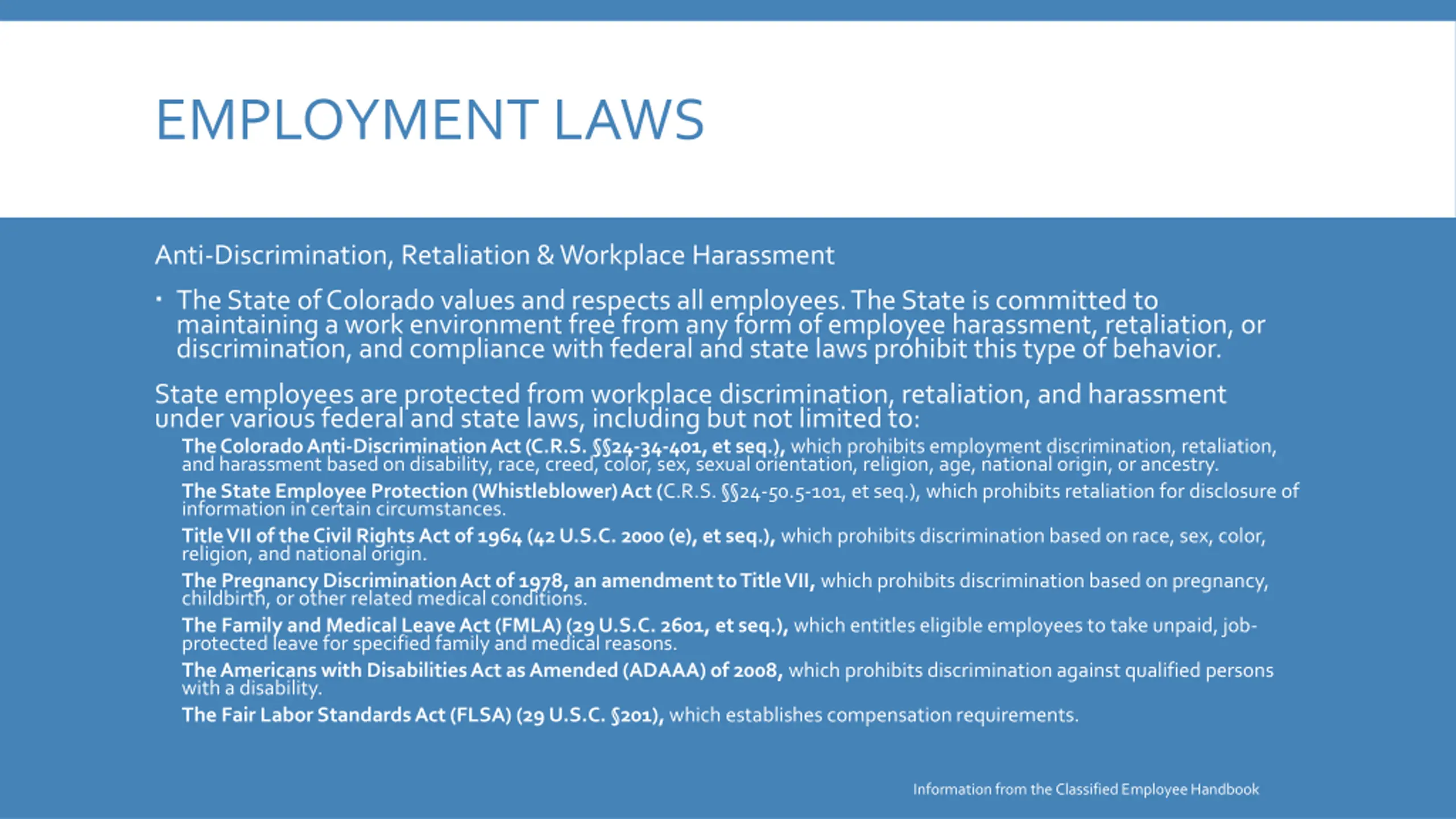 EMPLOYMENT LAWS Anti-Discrimination, Retaliation & Workplace Harassment The State of Colorado values and respects all employees. The State is committed to maintaining a work environment free from any form of employee harassment, retaliation, or discrimination, and compliance with federal and state laws prohibit this type of behavior. State employees are protected from workplace discrimination, retaliation, and harassment under various federal and state laws, including but not limited to: The Colorado Anti-Discrimination Act (C.R.S. 24-34-401, et seq.), which prohibits employment discrimination, retaliation, and harassment based on disability, race, creed, color, sex, sexual orientation, religion, age, national origin, or ancestry. The State Employee Protection (Whistleblower) Act (C.R.S. 24-50.5-101, et seq.), which prohibits retaliation for disclosure of information in certain circumstances. Title VII of the Civil Rights Act of 1964 (42 U.S.C. 2000 (e), et seq.), which prohibits discrimination based on race, sex, color, religion, and national origin. The Pregnancy Discrimination Act of 1978, an amendment to Title VII, which prohibits discrimination based on pregnancy, childbirth, or other related medical conditions. The Family and Medical Leave Act (FMLA) (29 U.S.C. 2601, et seq.), which entitles eligible employees to take unpaid, job- protected leave for specified family and medical reasons. The Americans with Disabilities Act as Amended (ADAAA) of 2008, which prohibits discrimination against qualified persons with a disability. The Fair Labor Standards Act (FLSA) (29 U.S.C. 201), which establishes compensation requirements. Information from the Classified Employee Handbook