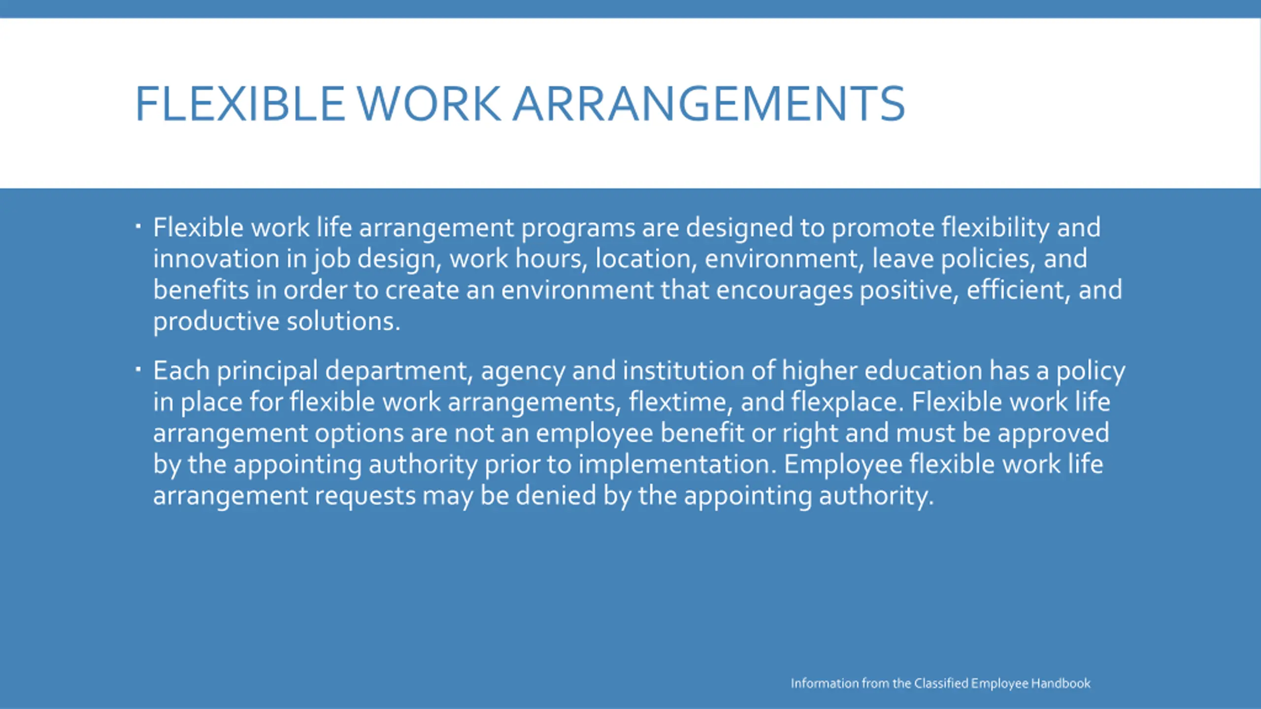 FLEXIBLE WORK ARRANGEMENTS Flexible work life arrangement programs are designed to promote flexibility and innovation in job design, work hours, location, environment, leave policies, and benefits in order to create an environment that encourages positive, efficient, and productive solutions. Each principal department, agency and institution of higher education has a policy in place for flexible work arrangements, flextime, and flexplace. Flexible work life arrangement options are not an employee benefit or right and must be approved by the appointing authority prior to implementation. Employee flexible work life arrangement requests may be denied by the appointing authority. Information from the Classified Employee Handbook