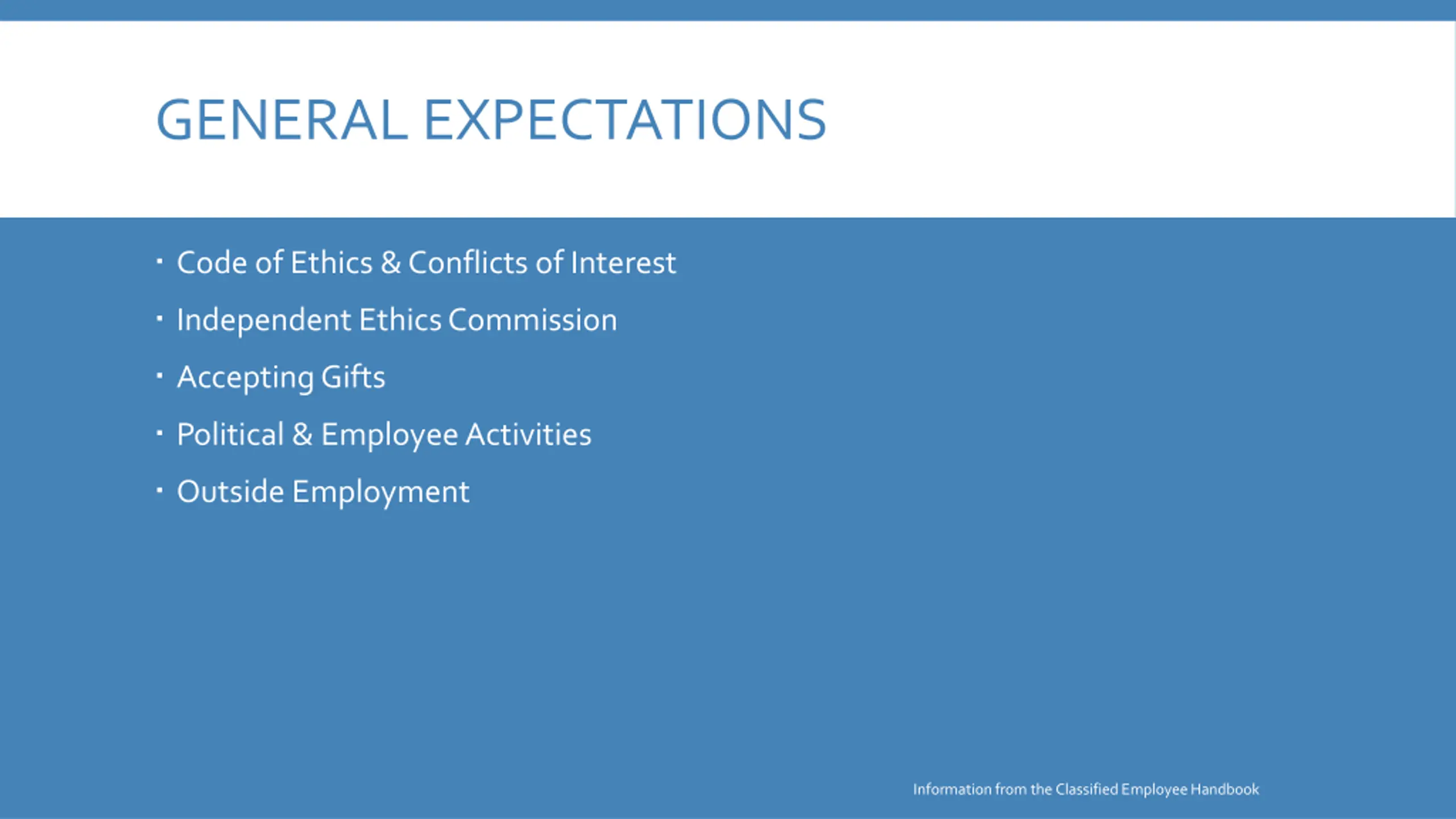 GENERAL EXPECTATIONS Code of Ethics & Conflicts of Interest Independent Ethics Commission Accepting Gifts Political & Employee Activities Outside Employment Information from the Classified Employee Handbook