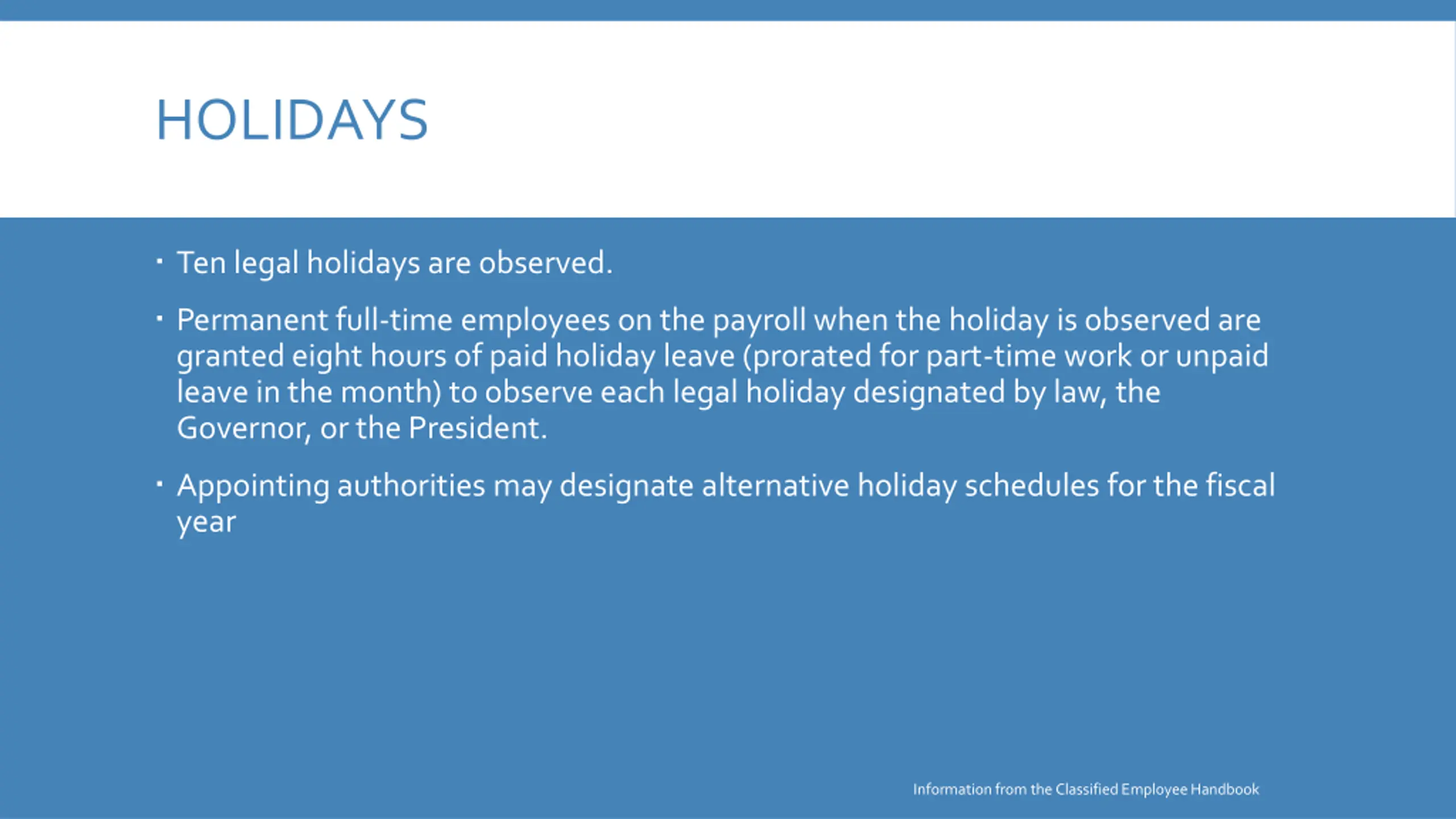 HOLIDAYS Ten legal holidays are observed. Permanent full-time employees on the payroll when the holiday is observed are granted eight hours of paid holiday leave (prorated for part-time work or unpaid leave in the month) to observe each legal holiday designated by law, the Governor, or the President. Appointing authorities may designate alternative holiday schedules for the fiscal year Information from the Classified Employee Handbook