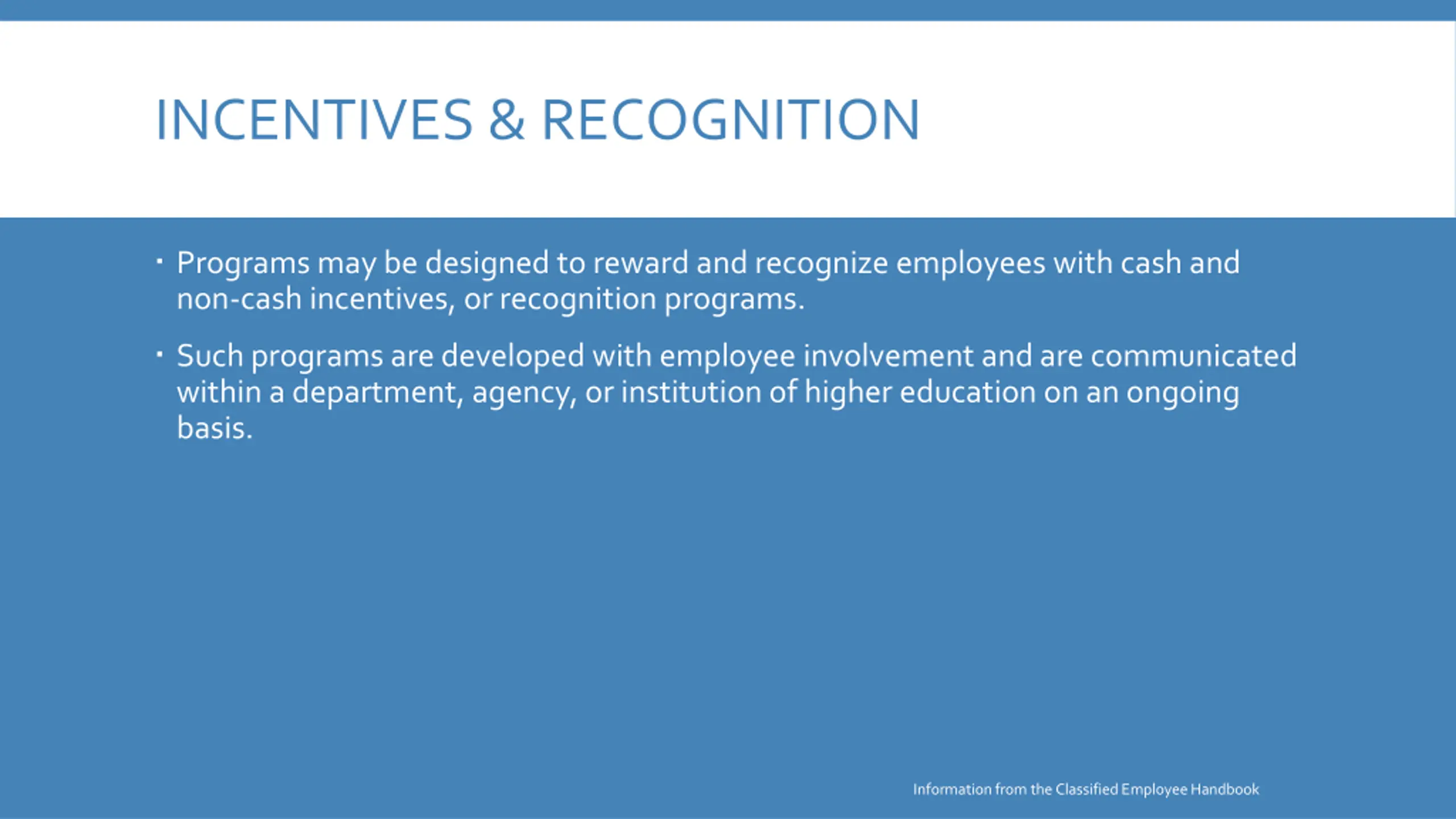 INCENTIVES & RECOGNITION Programs may be designed to reward and recognize employees with cash and non-cash incentives, or recognition programs. Such programs are developed with employee involvement and are communicated within a department, agency, or institution of higher education on an ongoing basis. Information from the Classified Employee Handbook