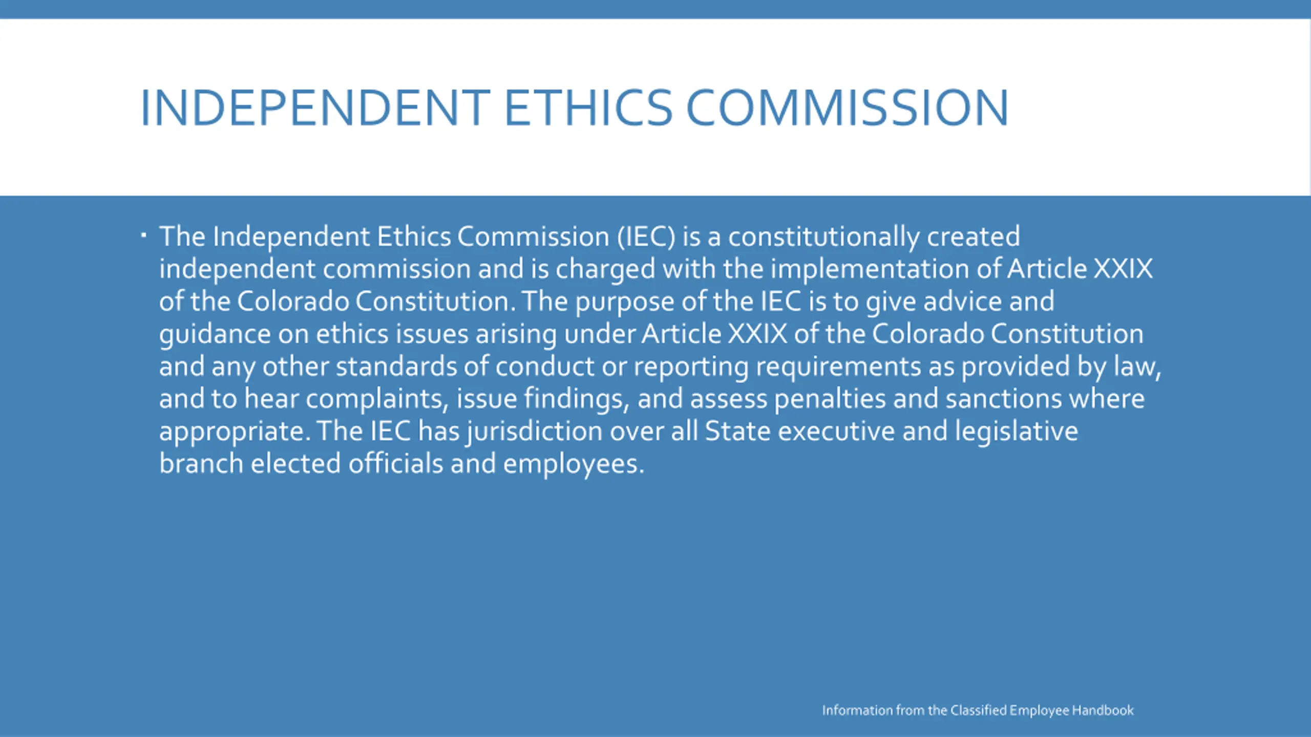 INDEPENDENT ETHICS COMMISSION The Independent Ethics Commission (IEC) is a constitutionally created independent commission and is charged with the implementation of Article XXIX of the Colorado Constitution. The purpose of the IEC is to give advice and guidance on ethics issues arising under Article XXIX of the Colorado Constitution and any other standards of conduct or reporting requirements as provided by law, and to hear complaints, issue findings, and assess penalties and sanctions where appropriate. The IEC has jurisdiction over all State executive and legislative branch elected officials and employees. Information from the Classified Employee Handbook