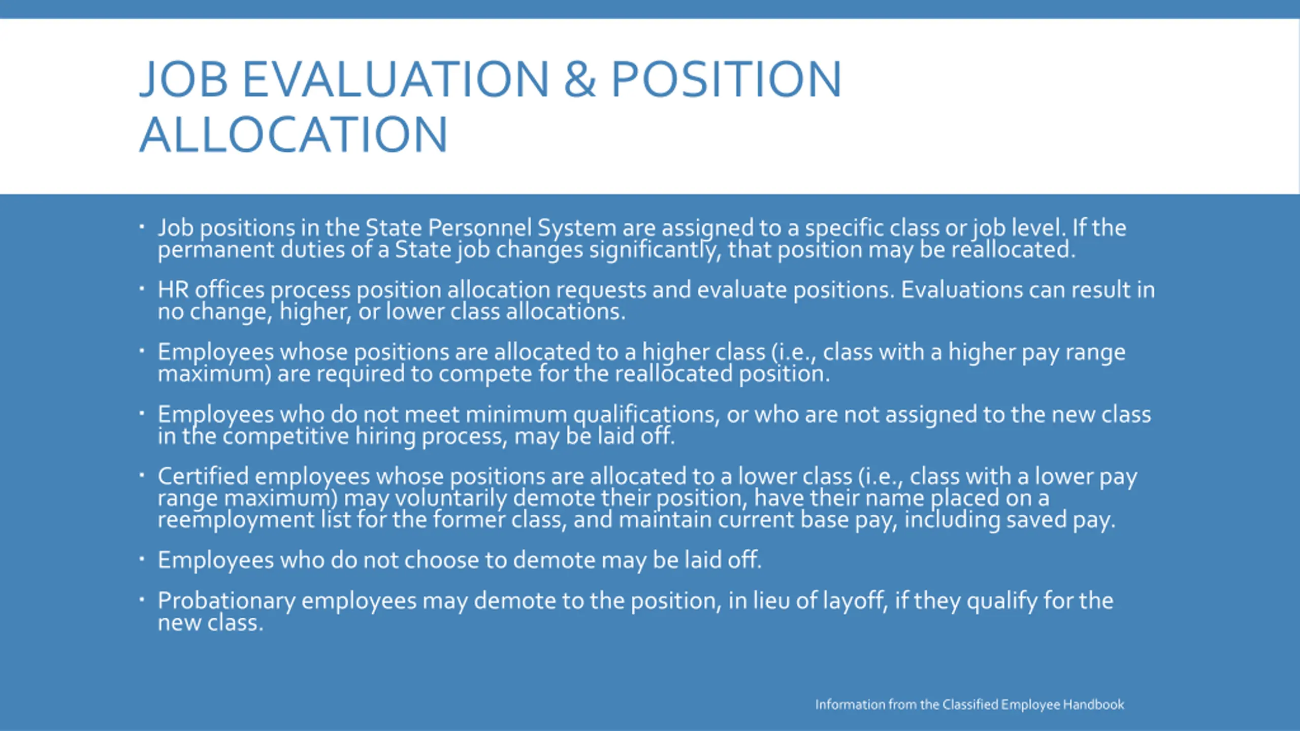 JOB EVALUATION & POSITION ALLOCATION Job positions in the State Personnel System are assigned to a specific class or job level. If the permanent duties of a State job changes significantly, that position may be reallocated. HR offices process position allocation requests and evaluate positions. Evaluations can result in no change, higher, or lower class allocations. Employees whose positions are allocated to a higher class (i.e., class with a higher pay range maximum) are required to compete for the reallocated position. Employees who do not meet minimum qualifications, or who are not assigned to the new class in the competitive hiring process, may be laid off. Certified employees whose positions are allocated to a lower class (i.e., class with a lower pay range maximum) may voluntarily demote their position, have their name placed on a reemployment list for the former class, and maintain current base pay, including saved pay. Employees who do not choose to demote may be laid off. Probationary employees may demote to the position, in lieu of layoff, if they qualify for the new class. Information from the Classified Employee Handbook