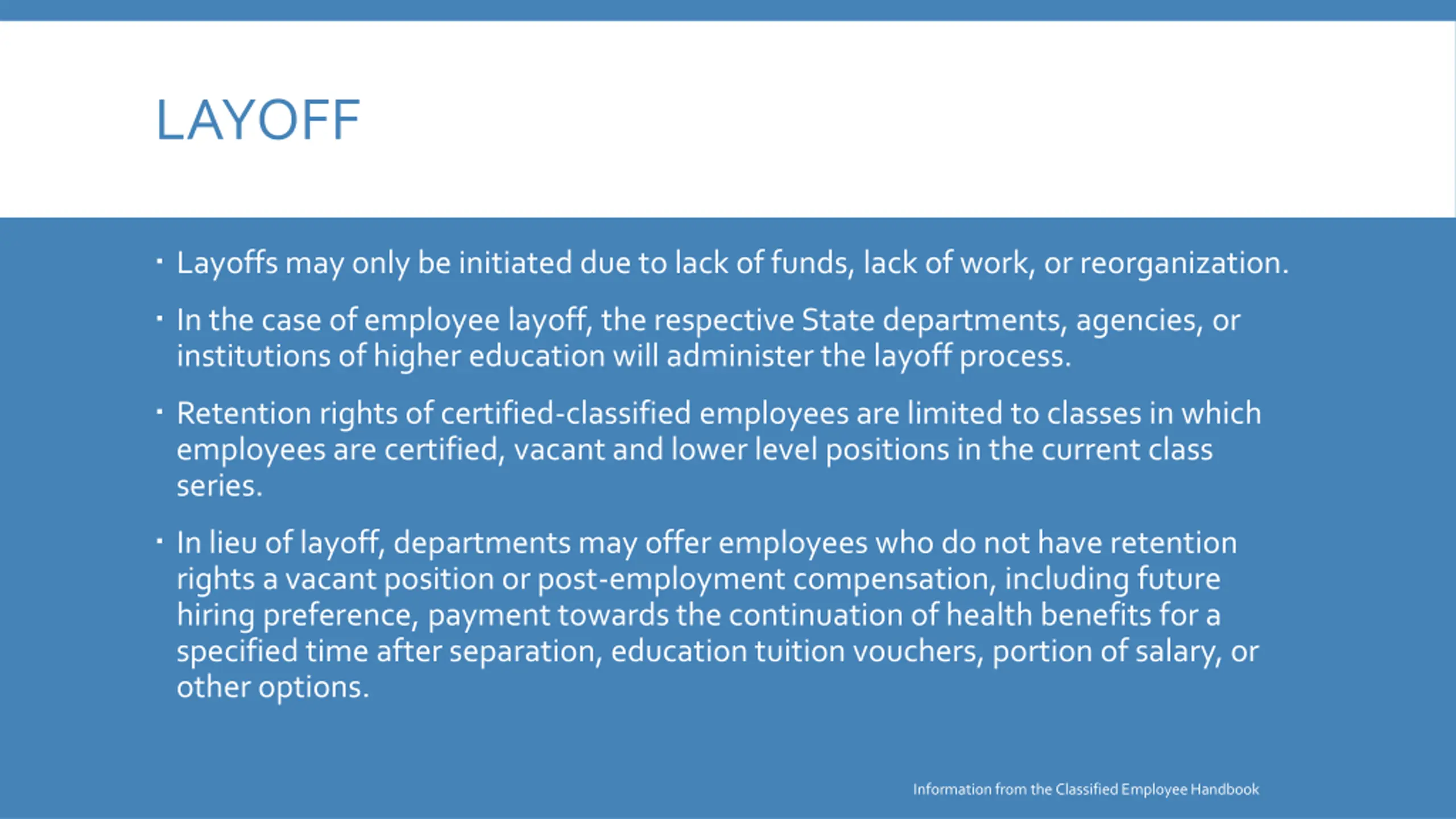 LAYOFF Layoffs may only be initiated due to lack of funds, lack of work, or reorganization. In the case of employee layoff, the respective State departments, agencies, or institutions of higher education will administer the layoff process. Retention rights of certified-classified employees are limited to classes in which employees are certified, vacant and lower level positions in the current class series. In lieu of layoff, departments may offer employees who do not have retention rights a vacant position or post-employment compensation, including future hiring preference, payment towards the continuation of health benefits for a specified time after separation, education tuition vouchers, portion of salary, or other options. Information from the Classified Employee Handbook