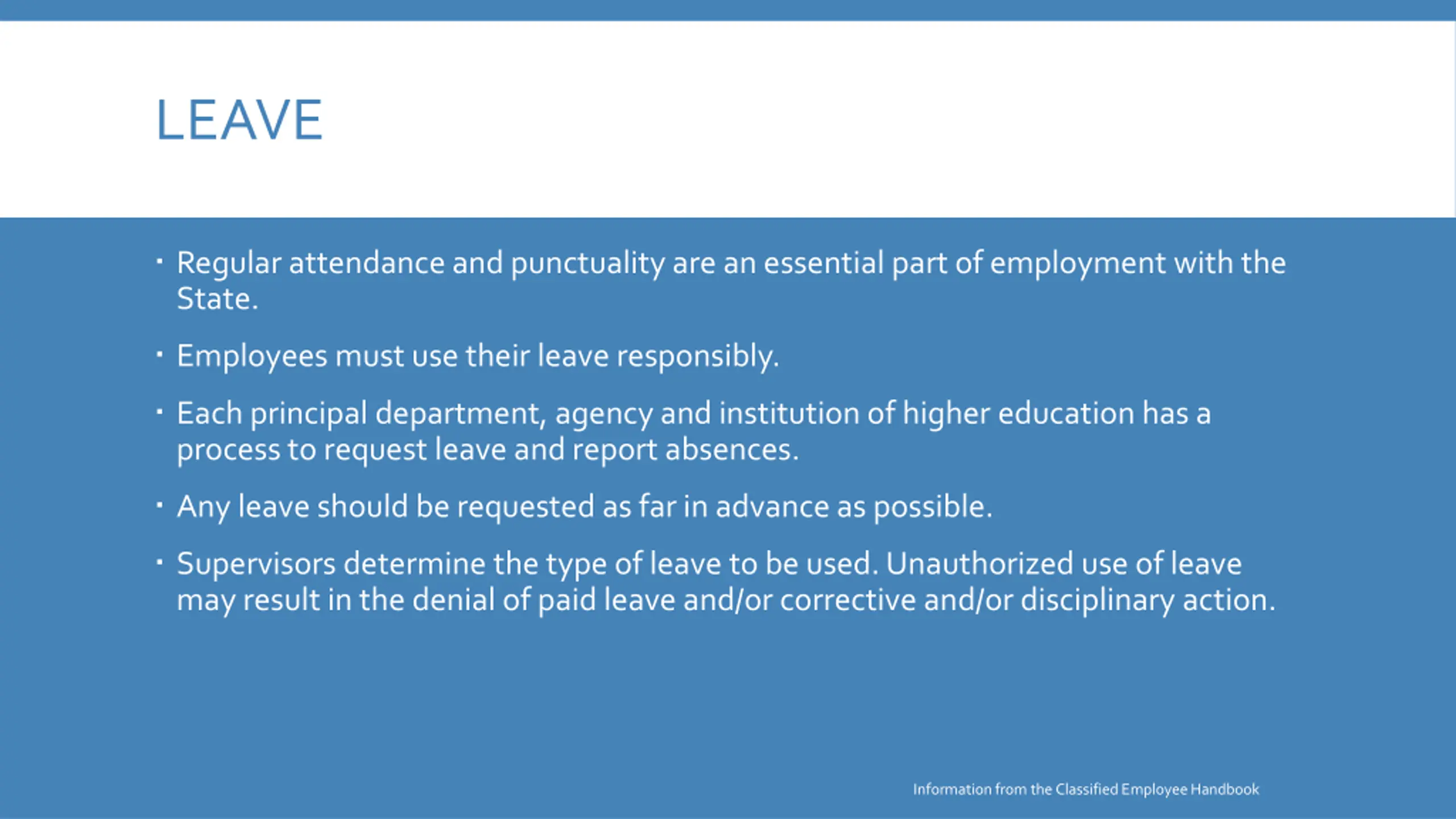 LEAVE Regular attendance and punctuality are an essential part of employment with the State. Employees must use their leave responsibly. Each principal department, agency and institution of higher education has a process to request leave and report absences. Any leave should be requested as far in advance as possible. Supervisors determine the type of leave to be used. Unauthorized use of leave may result in the denial of paid leave and/or corrective and/or disciplinary action. Information from the Classified Employee Handbook