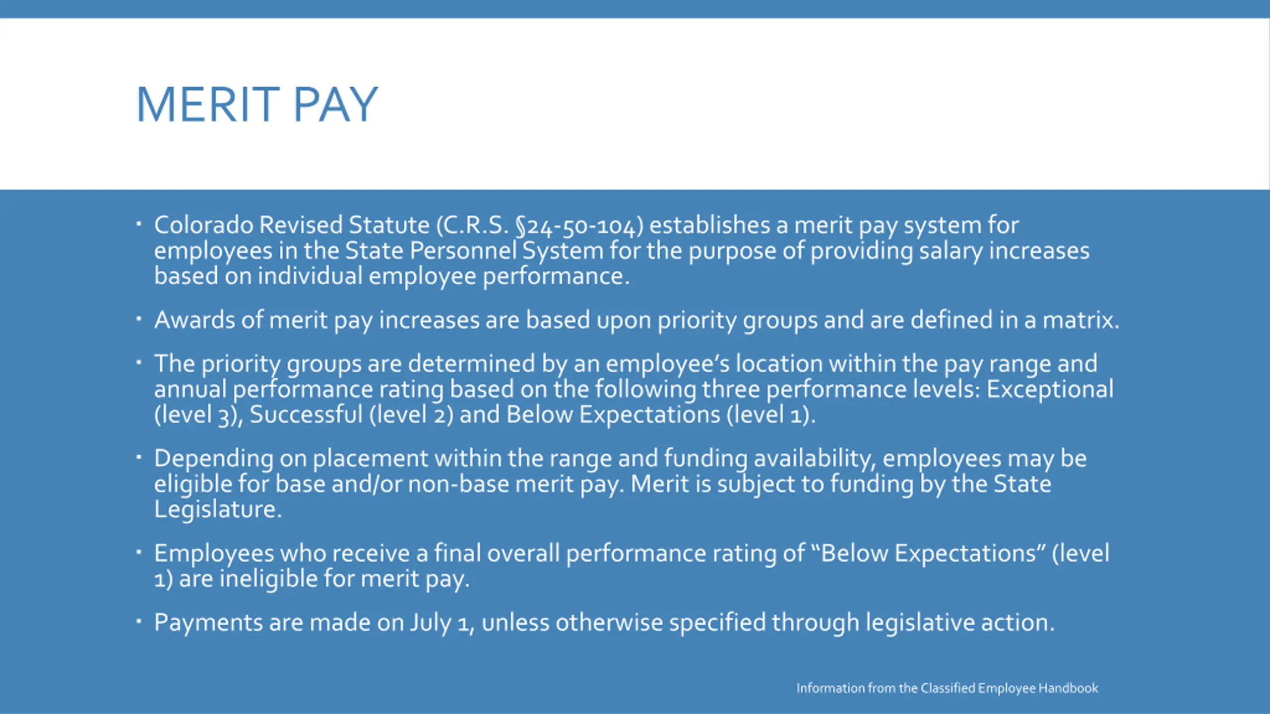 MERIT PAY Colorado Revised Statute (C.R.S. 24-50-104) establishes a merit pay system for employees in the State Personnel System for the purpose of providing salary increases based on individual employee performance. Awards of merit pay increases are based upon priority groups and are defined in a matrix. The priority groups are determined by an employee s location within the pay range and annual performance rating based on the following three performance levels: Exceptional (level 3), Successful (level 2) and Below Expectations (level 1). Depending on placement within the range and funding availability, employees may be eligible for base and/or non-base merit pay. Merit is subject to funding by the State Legislature. Employees who receive a final overall performance rating of Below Expectations (level 1) are ineligible for merit pay. Payments are made on July 1, unless otherwise specified through legislative action. Information from the Classified Employee Handbook