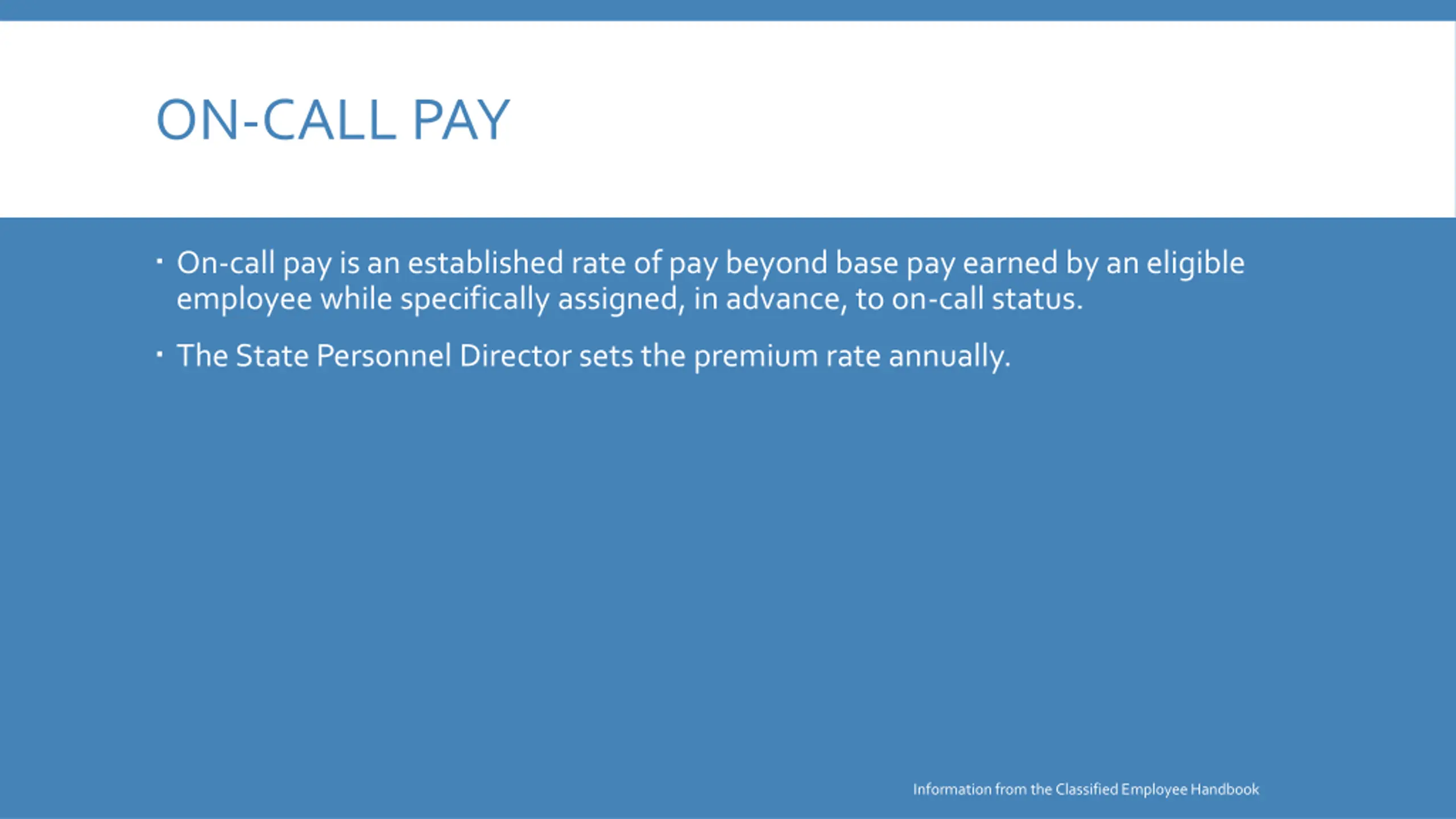 ON-CALL PAY On-call pay is an established rate of pay beyond base pay earned by an eligible employee while specifically assigned, in advance, to on-call status. The State Personnel Director sets the premium rate annually. Information from the Classified Employee Handbook