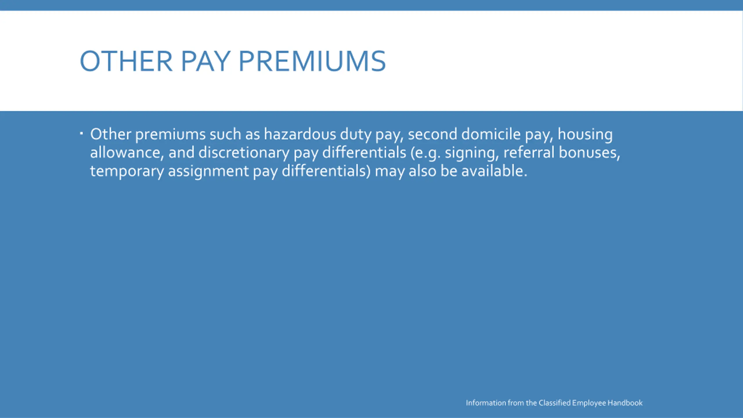 OTHER PAY PREMIUMS Other premiums such as hazardous duty pay, second domicile pay, housing allowance, and discretionary pay differentials (e.g. signing, referral bonuses, temporary assignment pay differentials) may also be available. Information from the Classified Employee Handbook