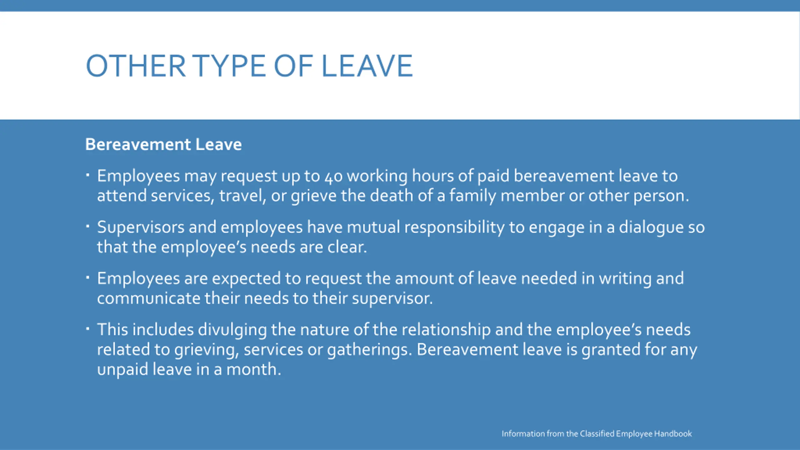 OTHER TYPE OF LEAVE Bereavement Leave Employees may request up to 40 working hours of paid bereavement leave to attend services, travel, or grieve the death of a family member or other person. Supervisors and employees have mutual responsibility to engage in a dialogue so that the employee s needs are clear. Employees are expected to request the amount of leave needed in writing and communicate their needs to their supervisor. This includes divulging the nature of the relationship and the employee s needs related to grieving, services or gatherings. Bereavement leave is granted for any unpaid leave in a month. Information from the Classified Employee Handbook