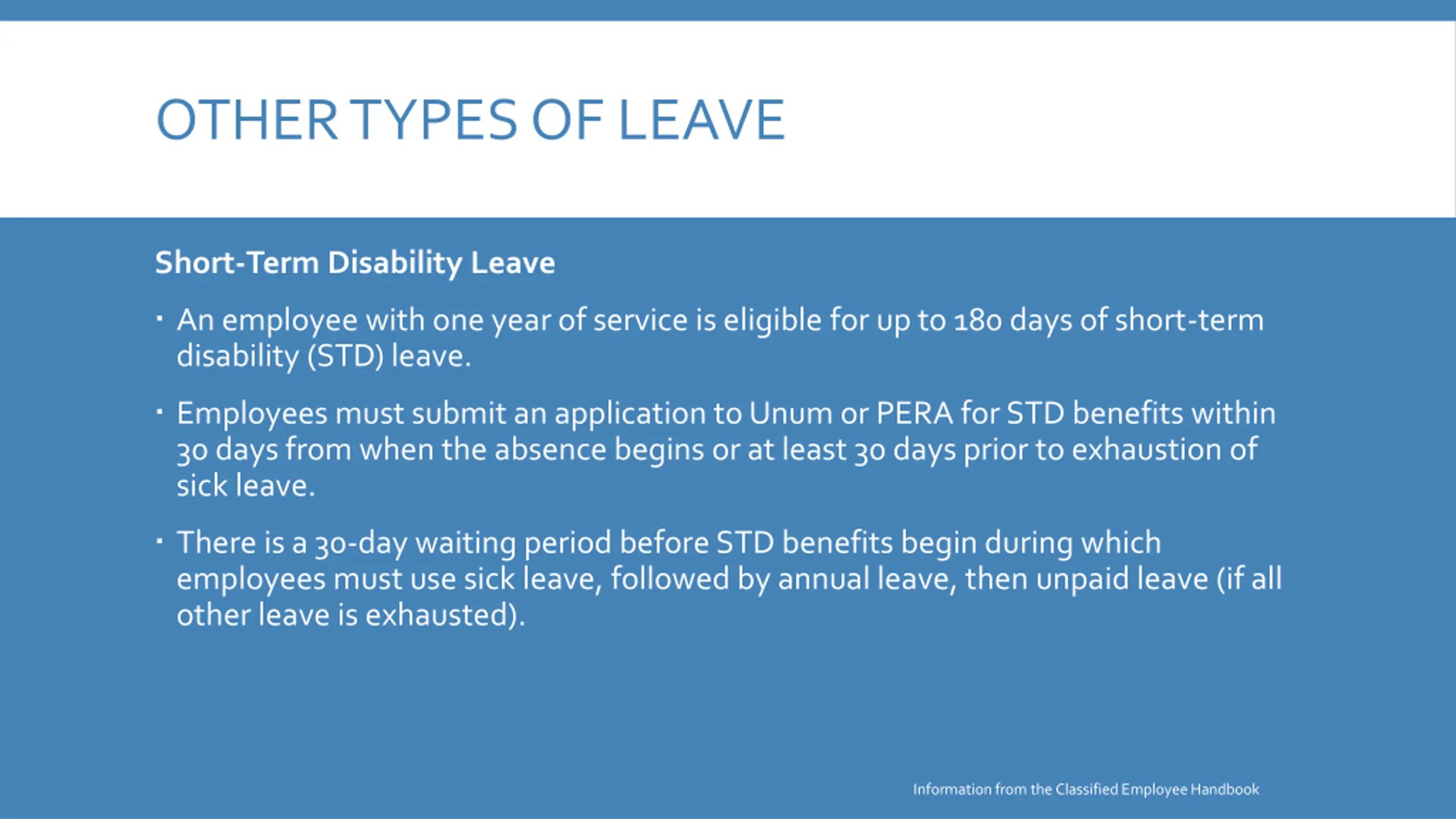 OTHER TYPES OF LEAVE Short-Term Disability Leave An employee with one year of service is eligible for up to 180 days of short-term disability (STD) leave. Employees must submit an application to Unum or PERA for STD benefits within 30 days from when the absence begins or at least 30 days prior to exhaustion of sick leave. There is a 30-day waiting period before STD benefits begin during which employees must use sick leave, followed by annual leave, then unpaid leave (if all other leave is exhausted). Information from the Classified Employee Handbook