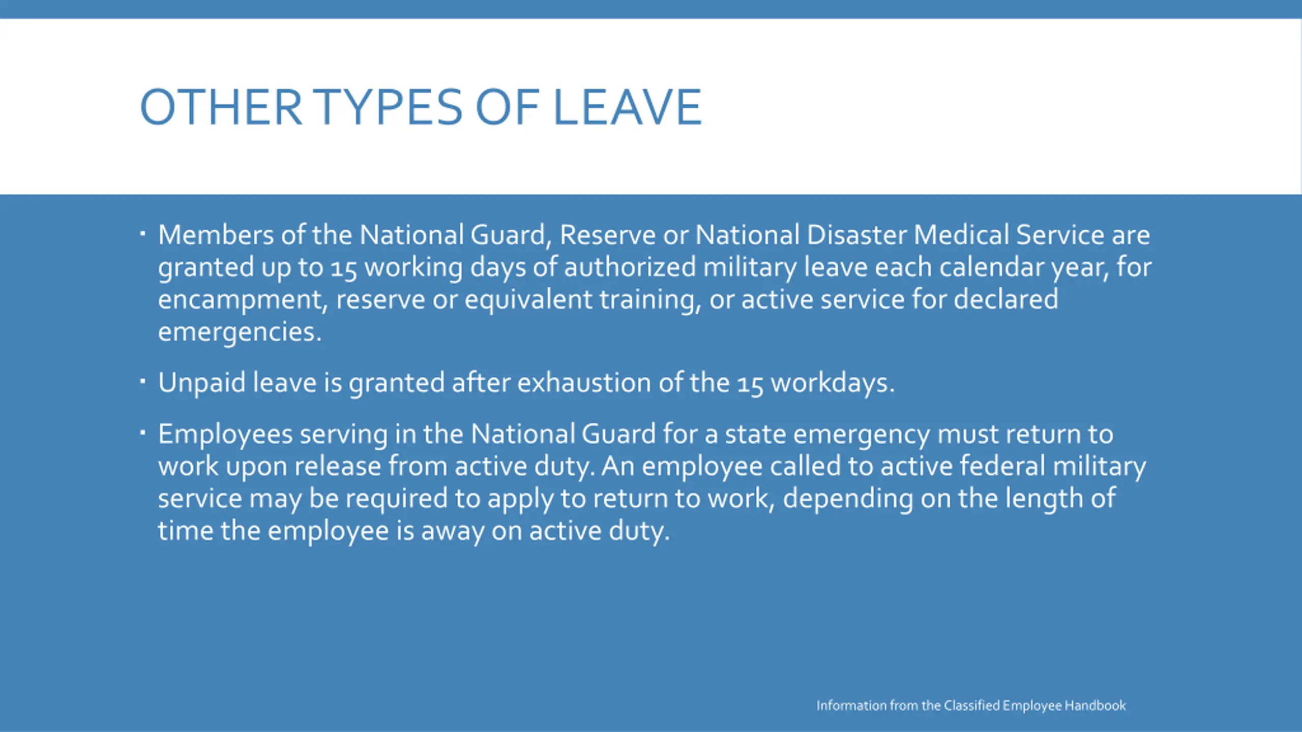 OTHER TYPES OF LEAVE Members of the National Guard, Reserve or National Disaster Medical Service are granted up to 15 working days of authorized military leave each calendar year, for encampment, reserve or equivalent training, or active service for declared emergencies. Unpaid leave is granted after exhaustion of the 15 workdays. Employees serving in the National Guard for a state emergency must return to work upon release from active duty. An employee called to active federal military service may be required to apply to return to work, depending on the length of time the employee is away on active duty. Information from the Classified Employee Handbook