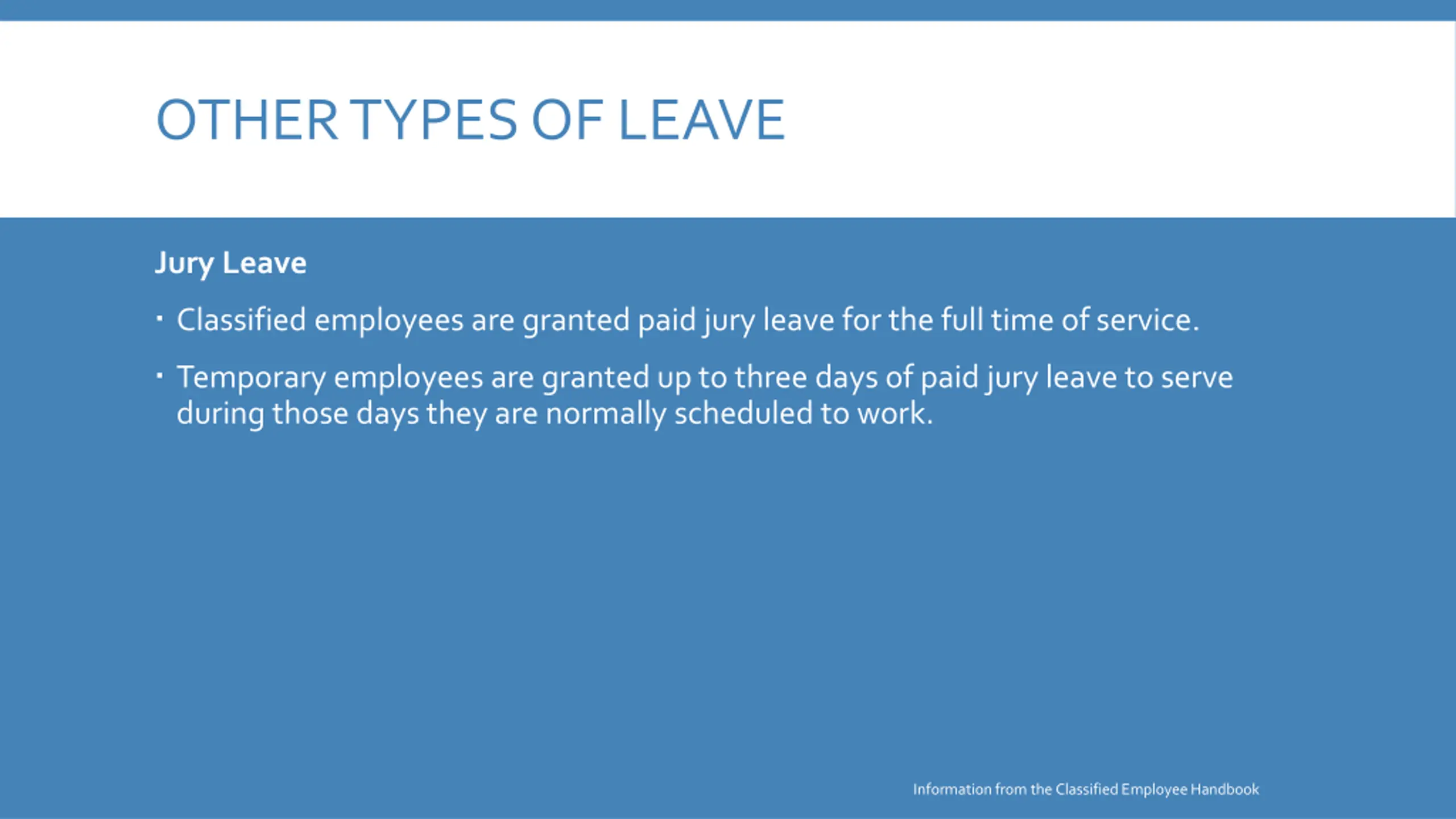 OTHER TYPES OF LEAVE Jury Leave Classified employees are granted paid jury leave for the full time of service. Temporary employees are granted up to three days of paid jury leave to serve during those days they are normally scheduled to work. Information from the Classified Employee Handbook