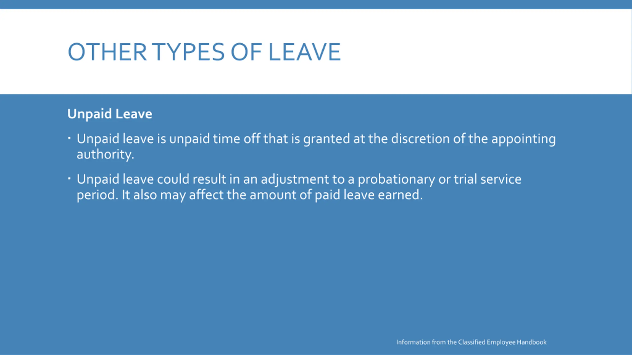 OTHER TYPES OF LEAVE Unpaid Leave Unpaid leave is unpaid time off that is granted at the discretion of the appointing authority. Unpaid leave could result in an adjustment to a probationary or trial service period. It also may affect the amount of paid leave earned. Information from the Classified Employee Handbook
