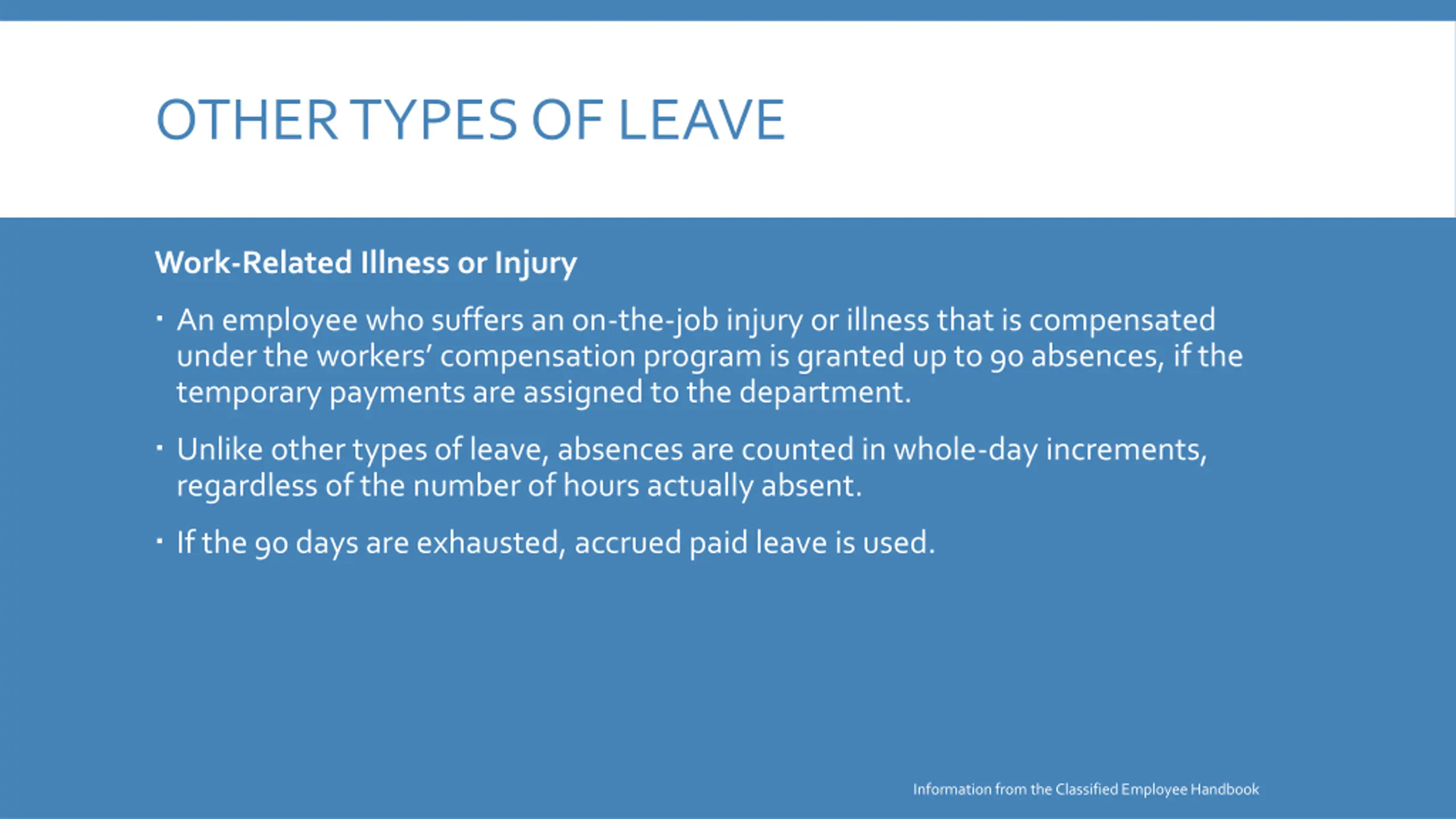 OTHER TYPES OF LEAVE Work-Related Illness or Injury An employee who suffers an on-the-job injury or illness that is compensated under the workers compensation program is granted up to 90 absences, if the temporary payments are assigned to the department. Unlike other types of leave, absences are counted in whole-day increments, regardless of the number of hours actually absent. If the 90 days are exhausted, accrued paid leave is used. Information from the Classified Employee Handbook