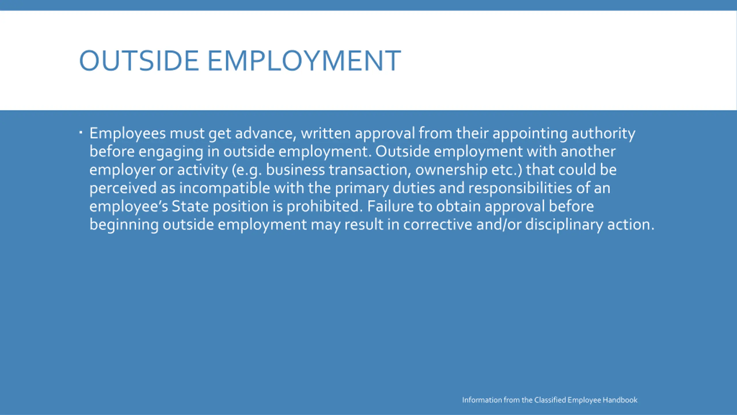 OUTSIDE EMPLOYMENT Employees must get advance, written approval from their appointing authority before engaging in outside employment. Outside employment with another employer or activity (e.g. business transaction, ownership etc.) that could be perceived as incompatible with the primary duties and responsibilities of an employee s State position is prohibited. Failure to obtain approval before beginning outside employment may result in corrective and/or disciplinary action. Information from the Classified Employee Handbook