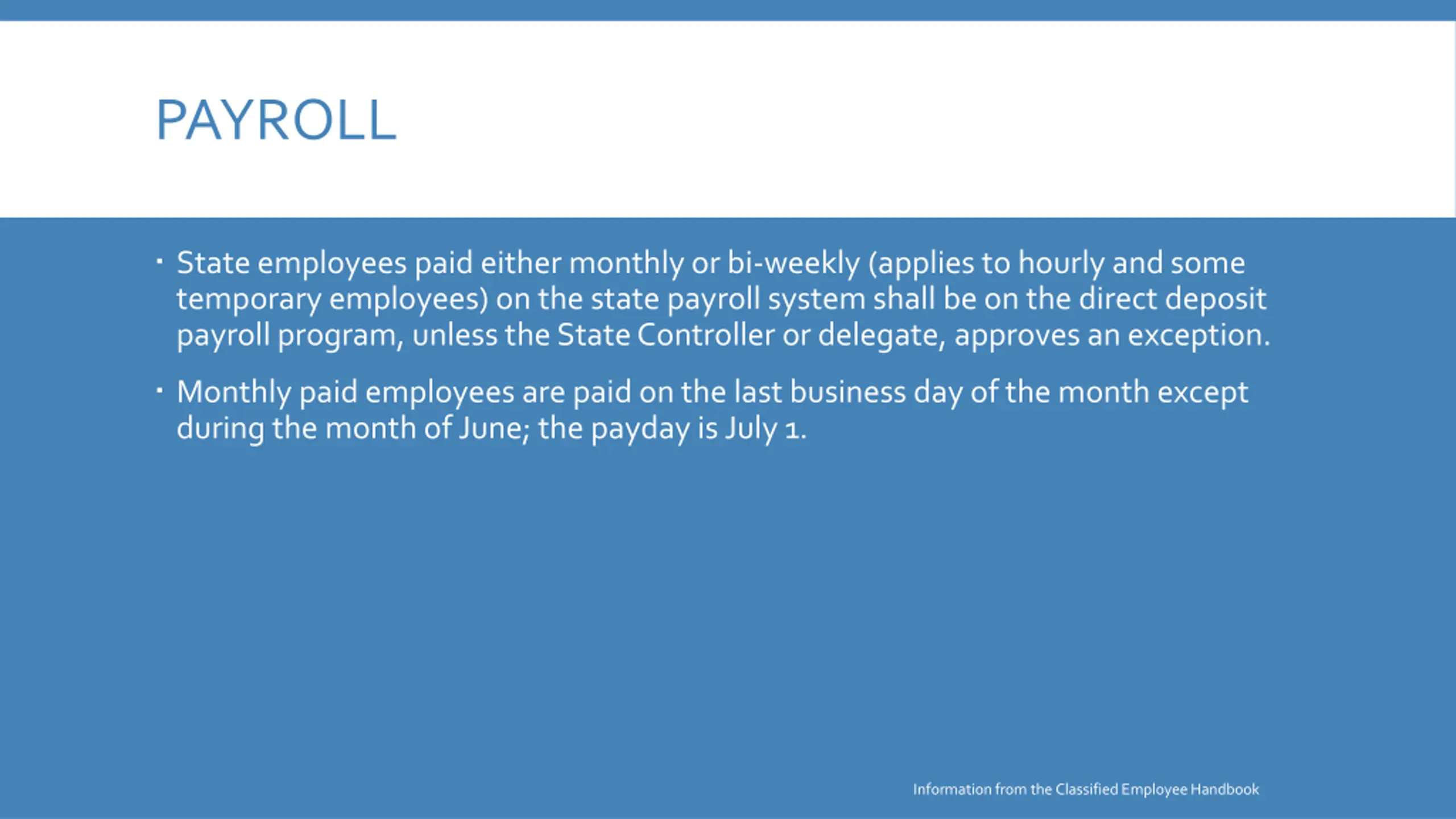 PAYROLL State employees paid either monthly or bi-weekly (applies to hourly and some temporary employees) on the state payroll system shall be on the direct deposit payroll program, unless the State Controller or delegate, approves an exception. Monthly paid employees are paid on the last business day of the month except during the month of June; the payday is July 1. Information from the Classified Employee Handbook