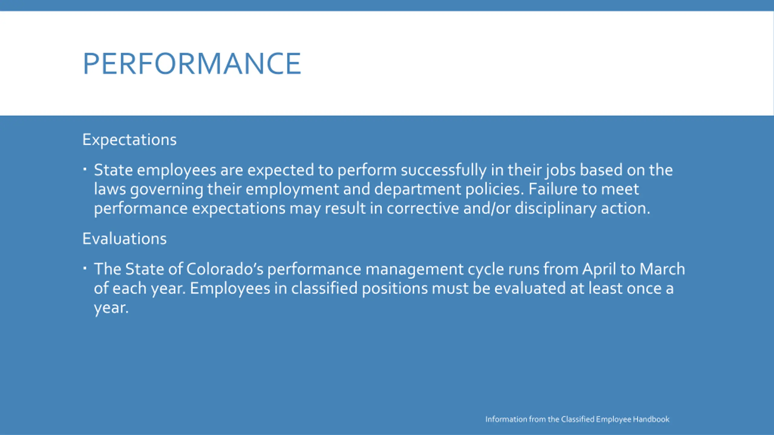 PERFORMANCE Expectations State employees are expected to perform successfully in their jobs based on the laws governing their employment and department policies. Failure to meet performance expectations may result in corrective and/or disciplinary action. Evaluations The State of Colorado s performance management cycle runs from April to March of each year. Employees in classified positions must be evaluated at least once a year. Information from the Classified Employee Handbook