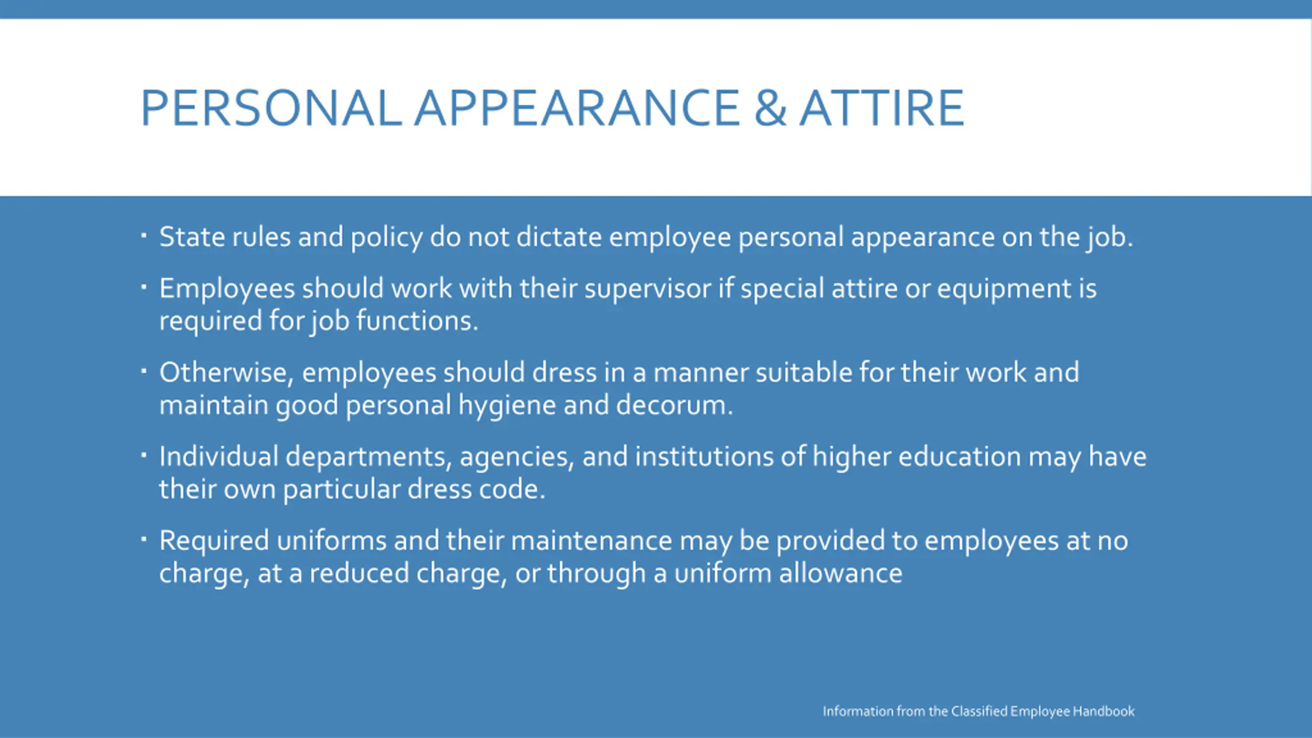 PERSONAL APPEARANCE & ATTIRE State rules and policy do not dictate employee personal appearance on the job. Employees should work with their supervisor if special attire or equipment is required for job functions. Otherwise, employees should dress in a manner suitable for their work and maintain good personal hygiene and decorum. Individual departments, agencies, and institutions of higher education may have their own particular dress code. Required uniforms and their maintenance may be provided to employees at no charge, at a reduced charge, or through a uniform allowance Information from the Classified Employee Handbook