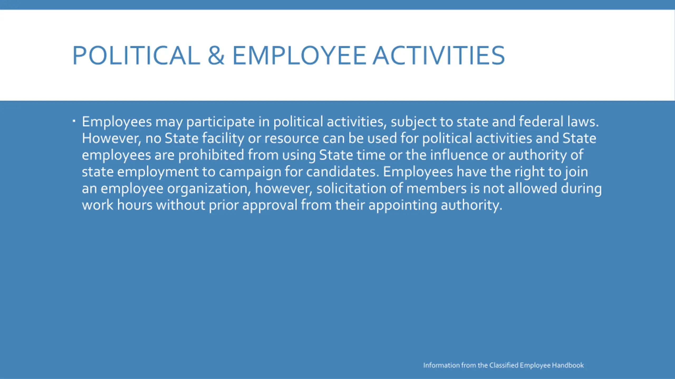 POLITICAL & EMPLOYEE ACTIVITIES Employees may participate in political activities, subject to state and federal laws. However, no State facility or resource can be used for political activities and State employees are prohibited from using State time or the influence or authority of state employment to campaign for candidates. Employees have the right to join an employee organization, however, solicitation of members is not allowed during work hours without prior approval from their appointing authority. Information from the Classified Employee Handbook