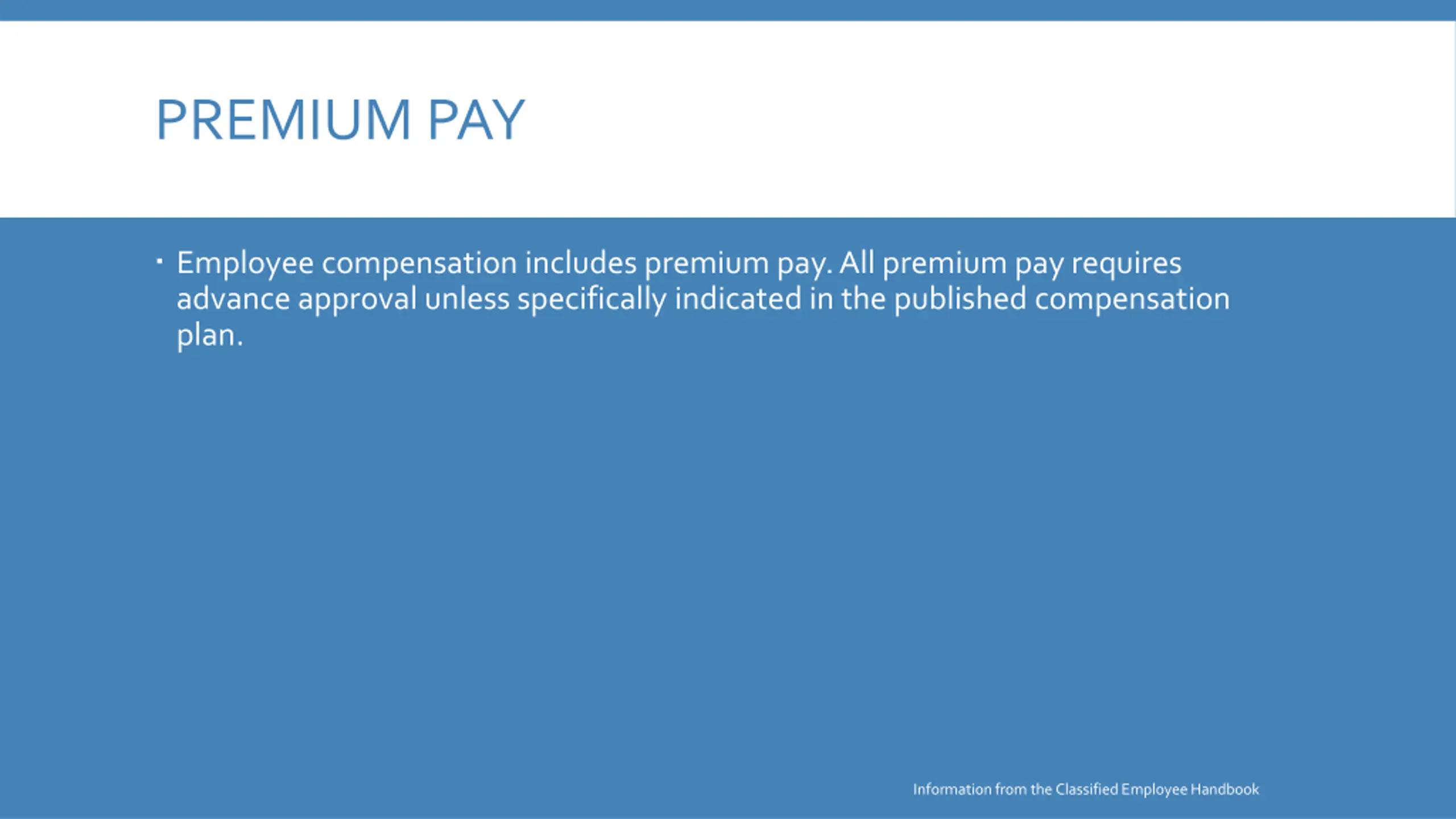 PREMIUM PAY Employee compensation includes premium pay. All premium pay requires advance approval unless specifically indicated in the published compensation plan. Information from the Classified Employee Handbook
