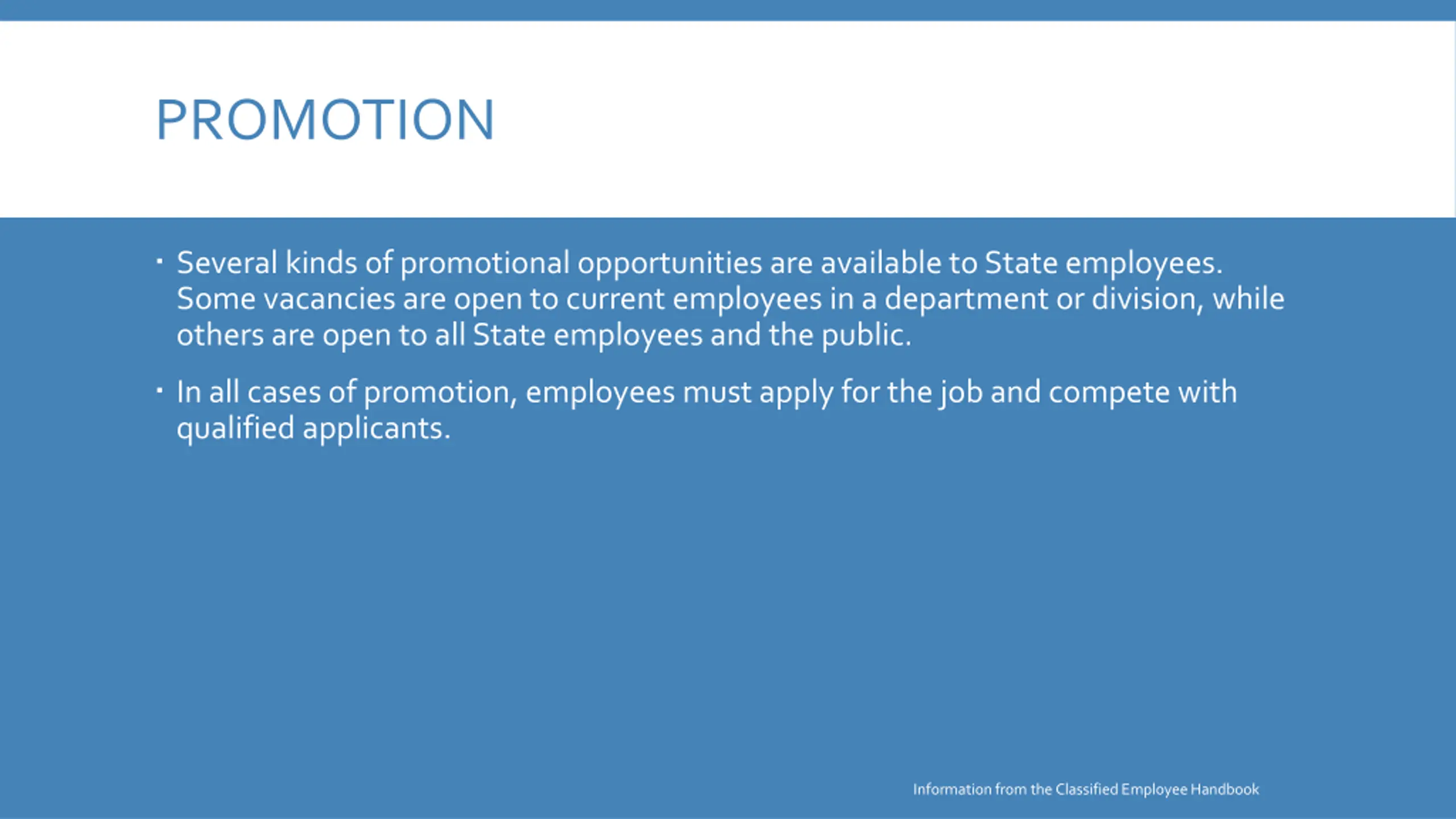PROMOTION Several kinds of promotional opportunities are available to State employees. Some vacancies are open to current employees in a department or division, while others are open to all State employees and the public. In all cases of promotion, employees must apply for the job and compete with qualified applicants. Information from the Classified Employee Handbook