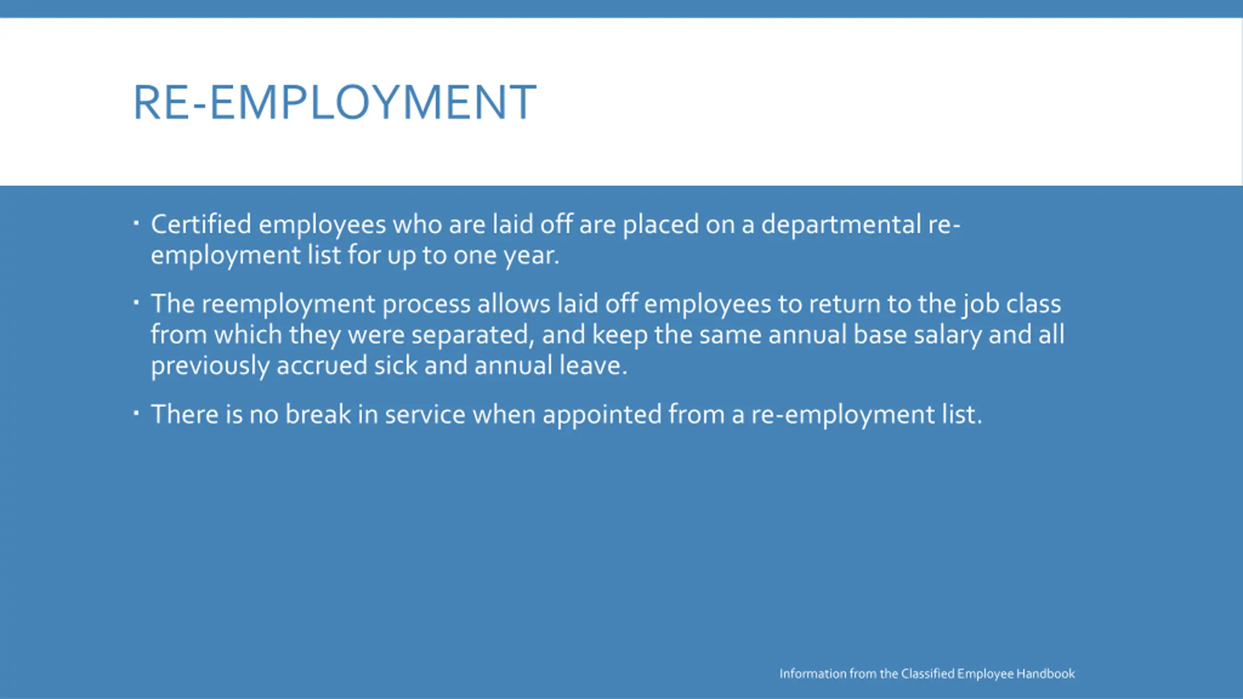 RE-EMPLOYMENT Certified employees who are laid off are placed on a departmental re- employment list for up to one year. The reemployment process allows laid off employees to return to the job class from which they were separated, and keep the same annual base salary and all previously accrued sick and annual leave. There is no break in service when appointed from a re-employment list. Information from the Classified Employee Handbook