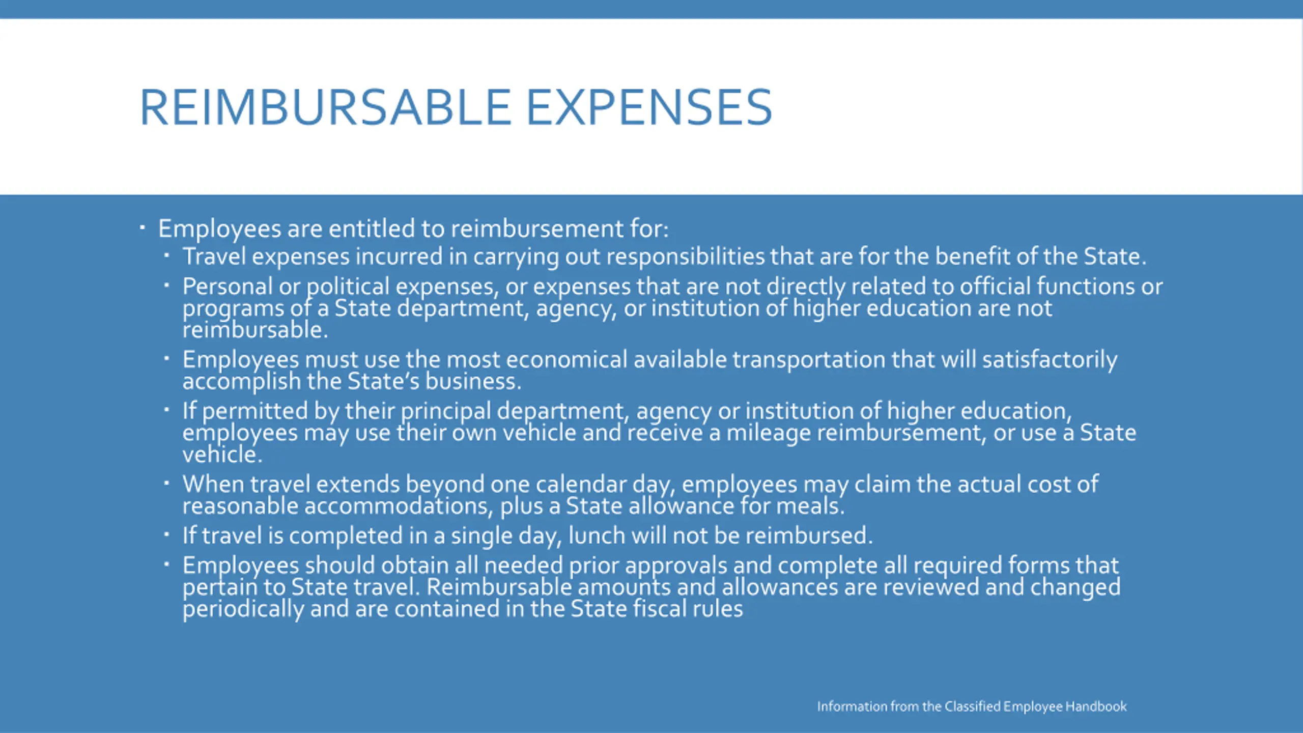 REIMBURSABLE EXPENSES Employees are entitled to reimbursement for: Travel expenses incurred in carrying out responsibilities that are for the benefit of the State. Personal or political expenses, or expenses that are not directly related to official functions or programs of a State department, agency, or institution of higher education are not reimbursable. Employees must use the most economical available transportation that will satisfactorily accomplish the State s business. If permitted by their principal department, agency or institution of higher education, employees may use their own vehicle and receive a mileage reimbursement, or use a State vehicle. When travel extends beyond one calendar day, employees may claim the actual cost of reasonable accommodations, plus a State allowance for meals. If travel is completed in a single day, lunch will not be reimbursed. Employees should obtain all needed prior approvals and complete all required forms that pertain to State travel. Reimbursable amounts and allowances are reviewed and changed periodically and are contained in the State fiscal rules Information from the Classified Employee Handbook